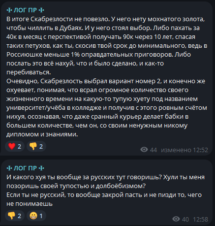Подумайте, русские. Подумайте о том, что ублюдок в чье образование с детства родители вкладывали деньги не смог сдать егэ и поступить на бюджет хотя бы в том же смоленске. Подумайте, почему с дипломом юриста переводит статьи в википедии с чатом джипити не может зарабатывать деньги в рф. Он интеллектуал, он написал одну статью для вестника международного юридического института (смоленский филиал) Подумайте и устыдитесь тому, что в вашей стране нет места такому человеку.