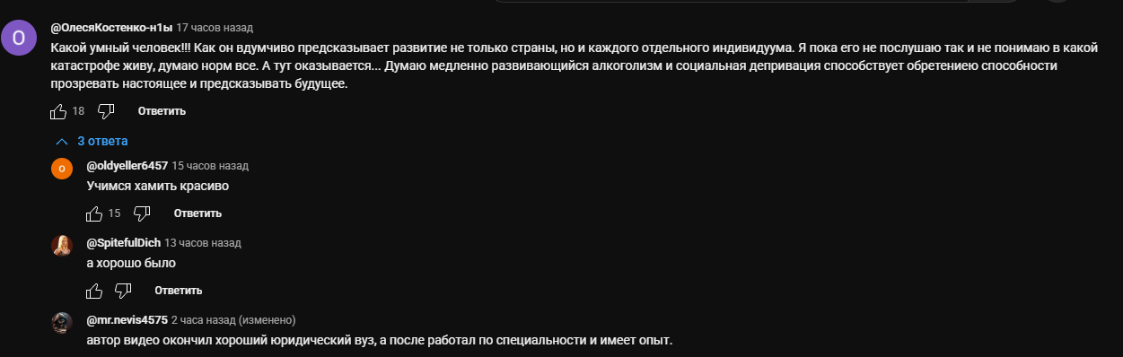 И что характерно, эта тактика работает. Подсосы Жмилевского считают его суперумным чуваком на основании того факта что он по кд срёт мини-лекциями, а его оппоненты просто заёбываются его слушать и не могут сходу ответить на очередную длиннющую тираду. Самим оппонентам тоже не хватает яиц затыкать и перебивать Жмиля, чтобы он чётко и кратко давал ответ на поставленный вопрос, они как будто не понимают что им пудрят мозг. Не понимают то ли из чрезмерной вежливости, то ли просто из глупости.