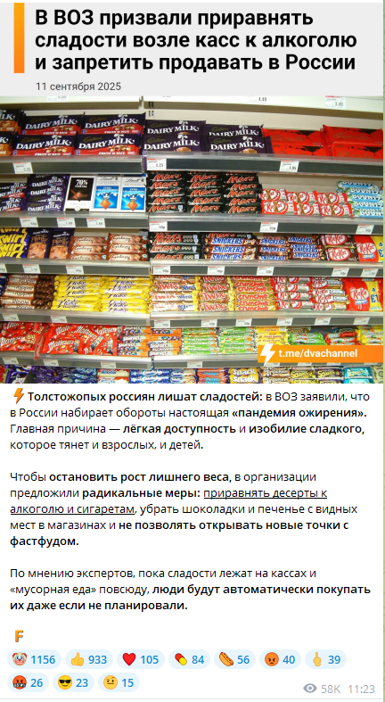 Норми-скот как обычно клоунов наставил, не смог разобраться в коротком тексте . А мне закон нравится, я против рекламы сладкого отовсюду: заебали жирные и дети жиреющие с детства-тратить бюджетные деньги на них, плюс работоспособность падает.