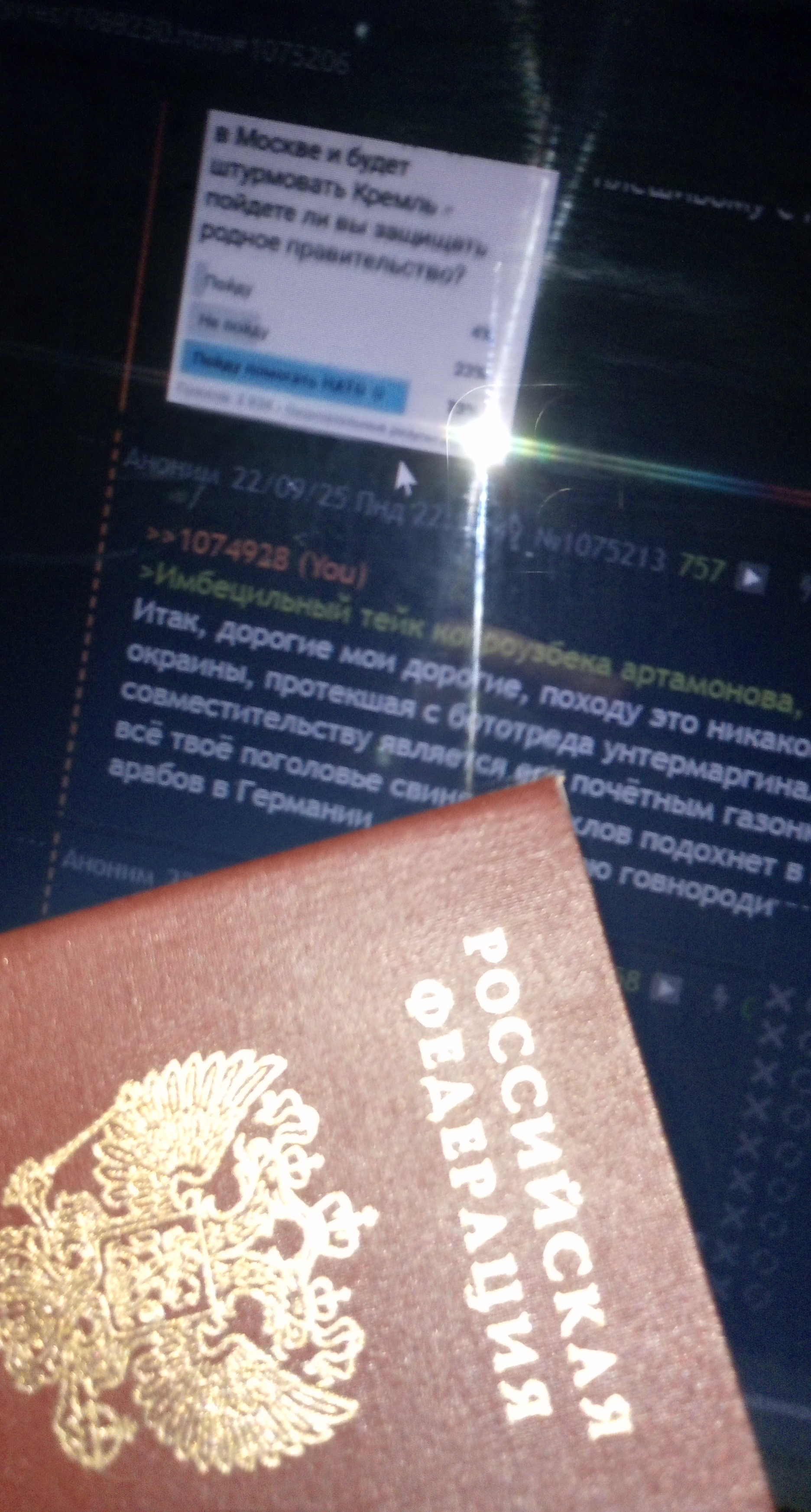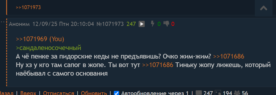 >>1075213 О, охуенно. Один в каждом посте видит своего протыкателя, другой внезапно проходит в хохлы. Чтобы было понятно, кто вообще составляет публику хейтеров Бориса Новое Олдовое, то это стопроцентное махровое быдло заводского розлива, прямиком из пролетарских семей пту-урусов. Реально надо пояснять? Вместо аргументов тейки из лахтинских методичек, парадигма "патриот пидорахии/либераха (или хохол), а третьего не дано, ведь неосовковую ультралевую скотоублюдию критиковать могут только эти две категории и рассуждения на уровне падика. Борямба был во всем прав.