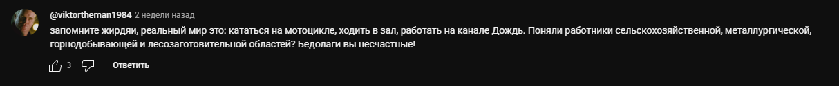 >>1072737 У дурака сельского по осени, по расписанию, фляга свистит С каждым годом всё громче. Чел просто написал ему про рацион и на "вы" Сельское чмо словил шизу, нахамил человеку и возбудиться настолько, что побежал ролик снимать про всю жизнь на спорте. Это пиздец. Реально шизик