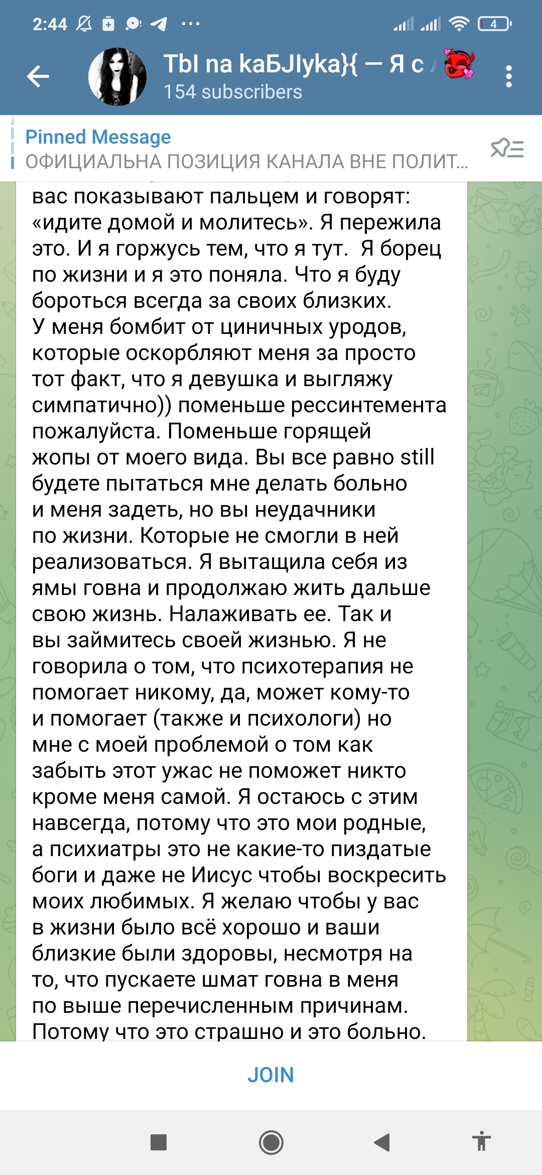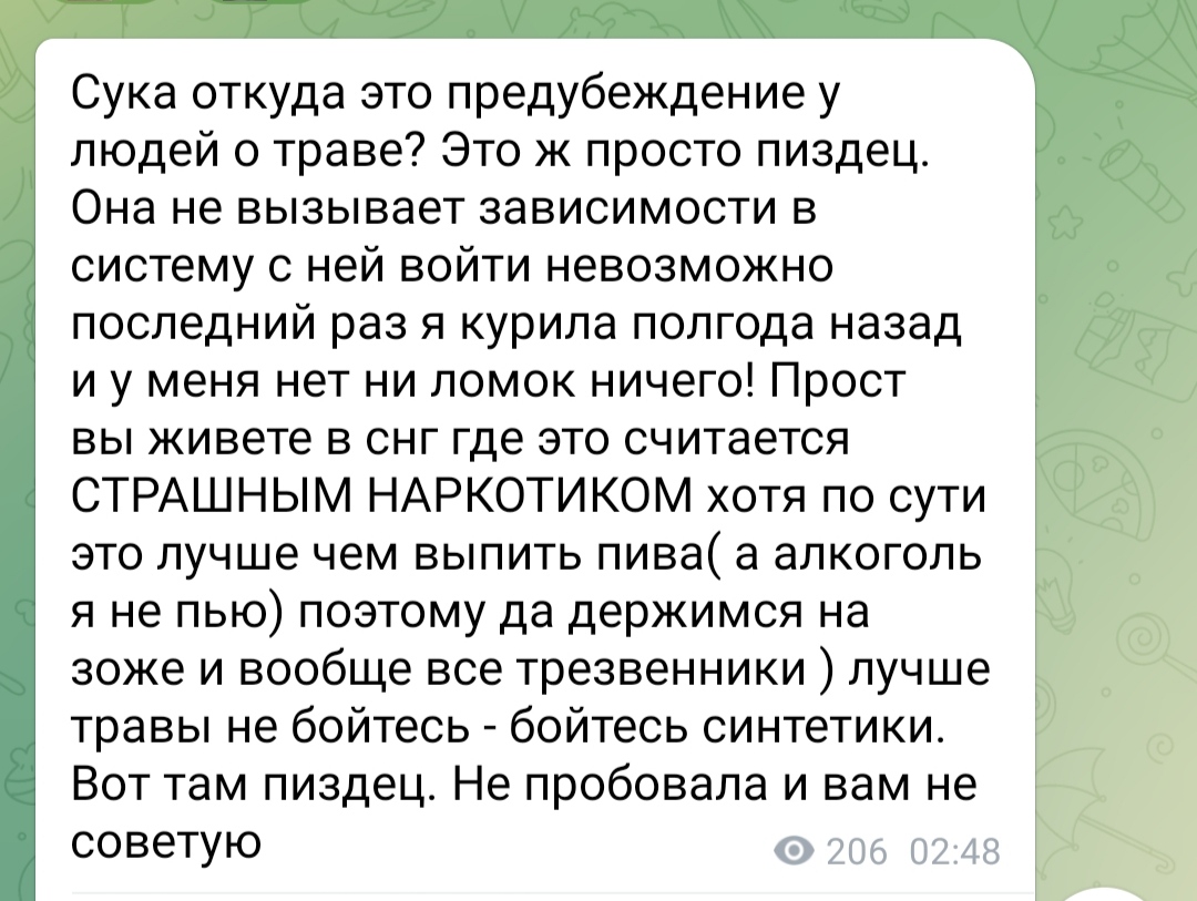 Что вы несете. Канал ей заблокировали из-за жалоб. Она постила фото травы, кружки записывала про это рассказывая подробно, помимо травы еще вещества были. Как она могла сама себя забанить - она модератор в телеграмме? Сомневаюсь. Хватит ребята искать везде многоходовочку с ее стороны и со стороны артамонова - в жизни все куда проще. Катька - наркоманка проживающая в сша, да, ее родня действующие сотрудники. Так бывает, мир несправедлив и наказания долго нет, пока сам не подтолкнешь дело в нужное направление. Я уж лумаю, что и модераторов кати тут нет, а срет теорией "она в волгограде" искреннне тупой человек и тролль.