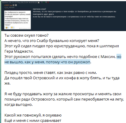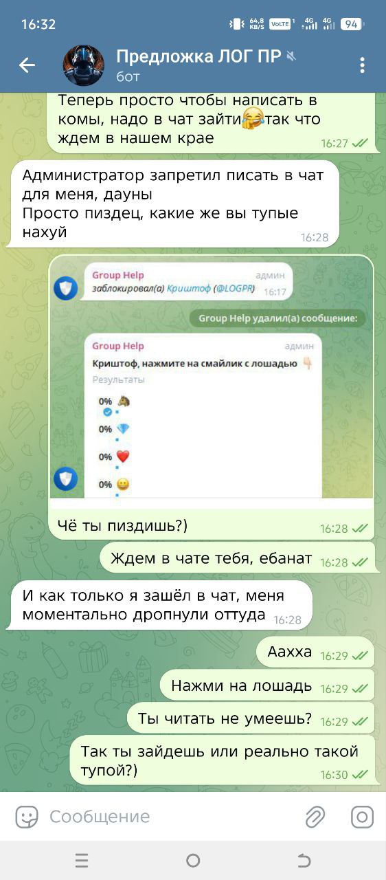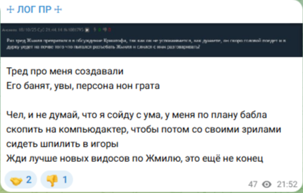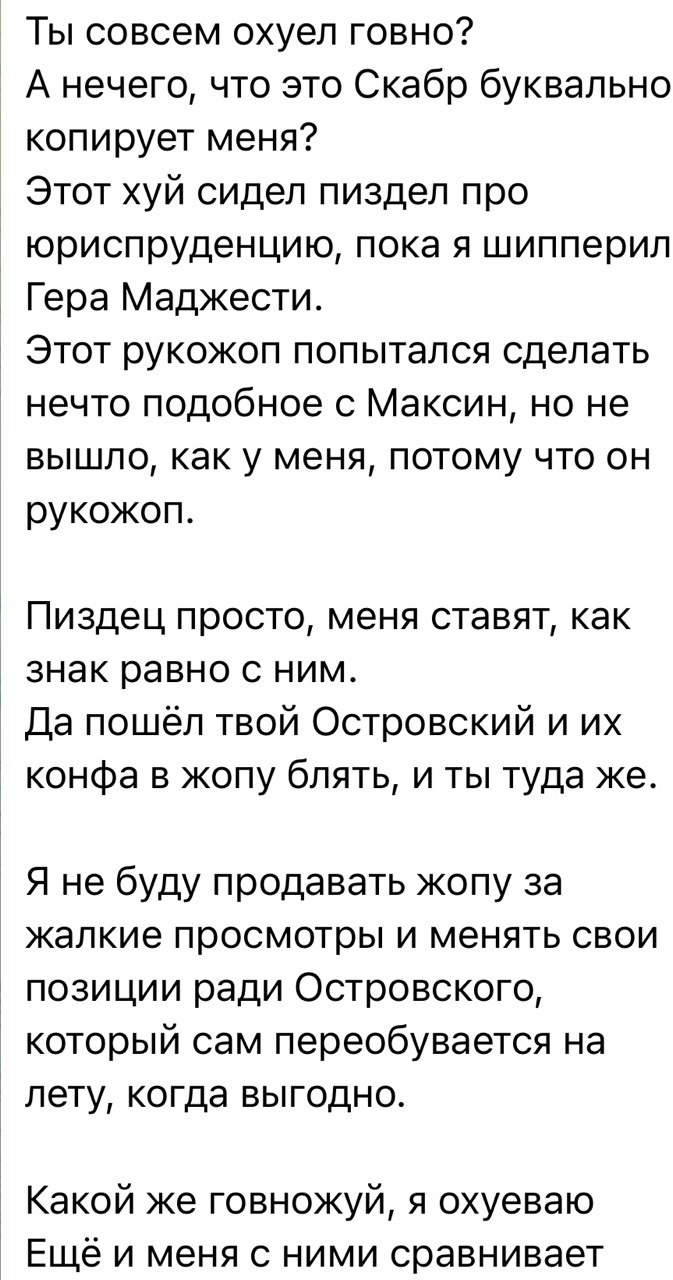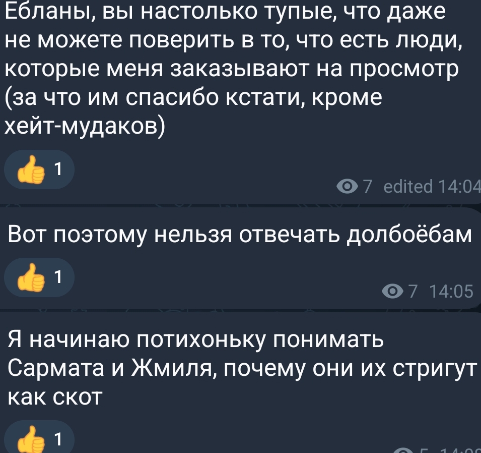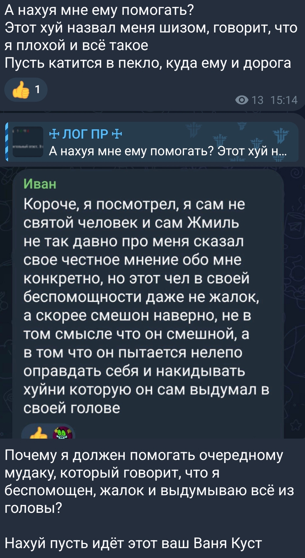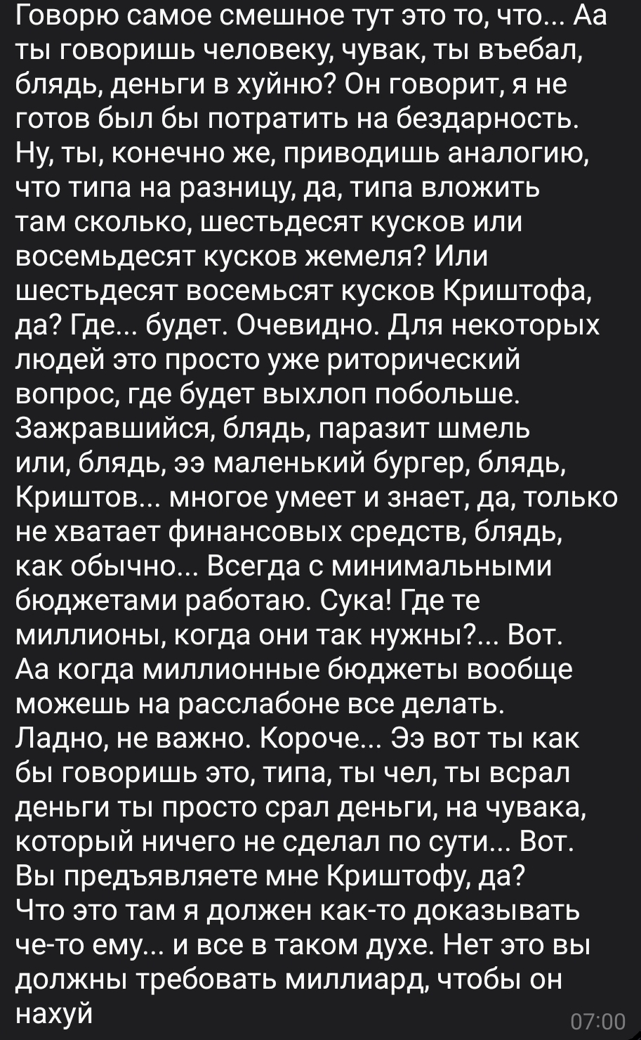 Ну а теперь шиз... В первые за очень долгое время прослушал голосовые психически больного человека, но видимо зря ибо ничего нового он из себя выдавить, увы, не смог на мой вышенаписанный пост "ВСЁ ВЫДУМАЛИ, ВЫ ТУПЫЕ, КРИСТОФЕР АКРОСС ПРОЕБАЛ ДЕНЬГИ, ЧТОБЫ ЖМИЛЬ РАЗЪЕБАЛ и т,д" Буквально первые два тейки я уже прояснял, шиз, тебе, но твоя наглухо отбитая голова просто не желает это принять в виду разрушения своего "БЕССТРАШНОГО ОБРАЗА РАЗОБЛАЧИТЕЛЯ", который я и большинство точно "ВЫДУМАЛИ". Про то как я якобы въебал свои деньги ради разъёба мне и вовсе становится смешным... Ведь я сделал это не потому что чаттерсы из Большой Лубянки меня попросили завести контент на стриме(Пруфы чего как были так и остались в чате, который ты не смог осилить из-за ЛОШАДКИ)))), неееет. Всё именно так, как шиз на Криштофе пытается преподнести, но даже на эту выдуманную абсолютно поебень мне есть, что ответить. Свои деньги я буду тратить на то что хочу и когда хочу и никто из бездарей на подобие тебя, шиз, не посмеют мне и слова поперёк сказать. Ведь сперва сами научитесь не дрочить на копейки, а распоряжаться нормальными суммами, а только после предъявляйте другим за их "НЕПРАВИЛЬНОЕ ИСПОЛЬЗОВАНИЕ" Ну и далее у нас пошёл очередной повторный анонс своего "видоса" про Жмиля. Вначале обращался к Жмилю, которому объективно абсолютно похрен на тебя и в виду этого ты решился переключить на нас - ужасных подсосов. Лично я отвечу только за себя тут, мне тоже не особо интересен ты в плане твоих шизоразборов. Твой пик был достигнут в моменте, когда ты МОЛИЛ МЭДДИСОНА О ПОМОЩИ и на этом, увы, всё. Видосы, которые буквально подкреплены лишь твоей желчью и неприкрытой ложью не несут в себя НИ-ЧЕ-ГО, потому лично я с тобой заканчиваю. Ты не меняешься. Ты как был больным бездарем, так им и остался, в чём я тебе лично могу только посочувствовать. Добра