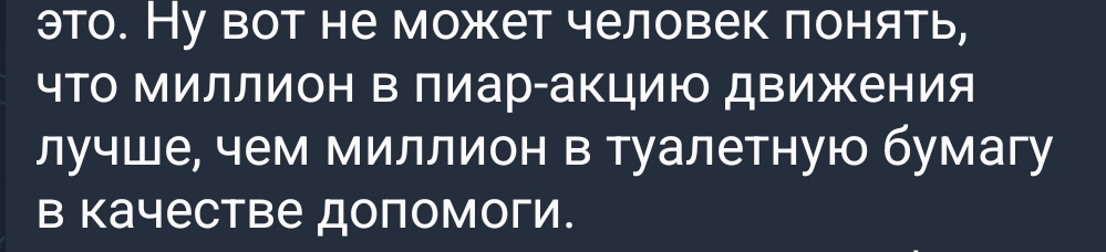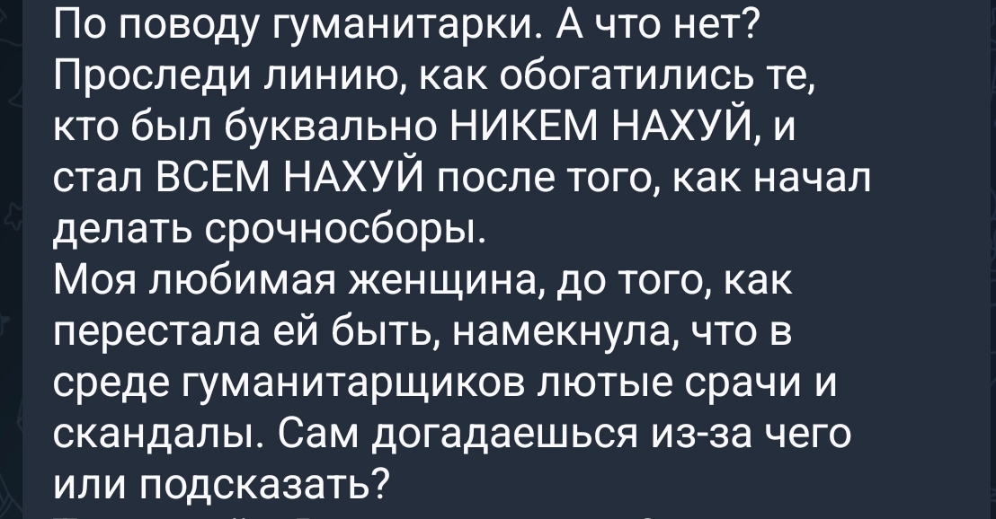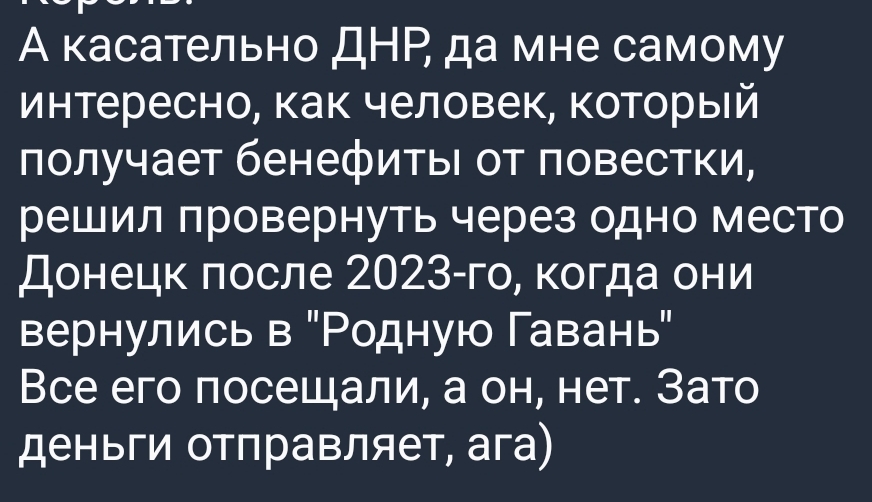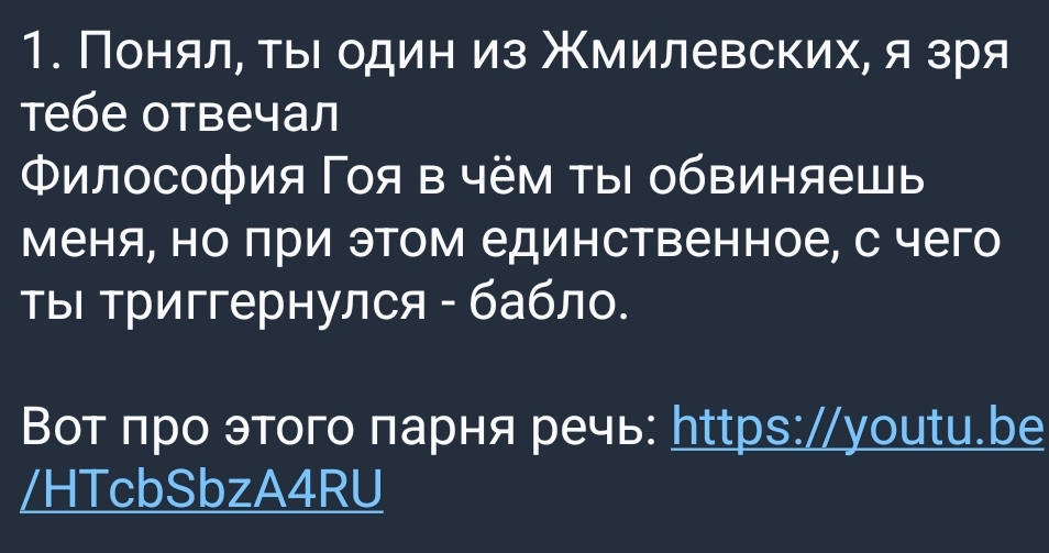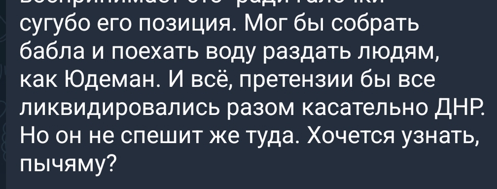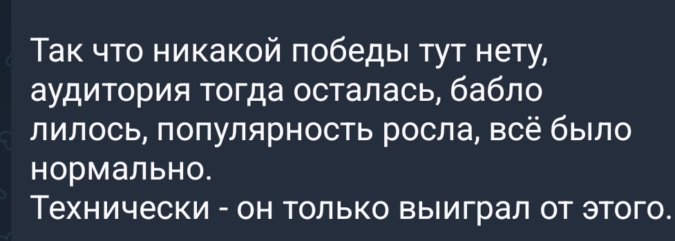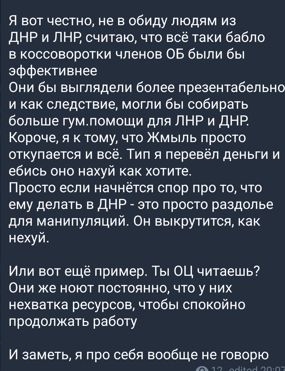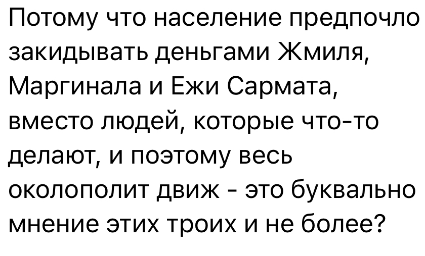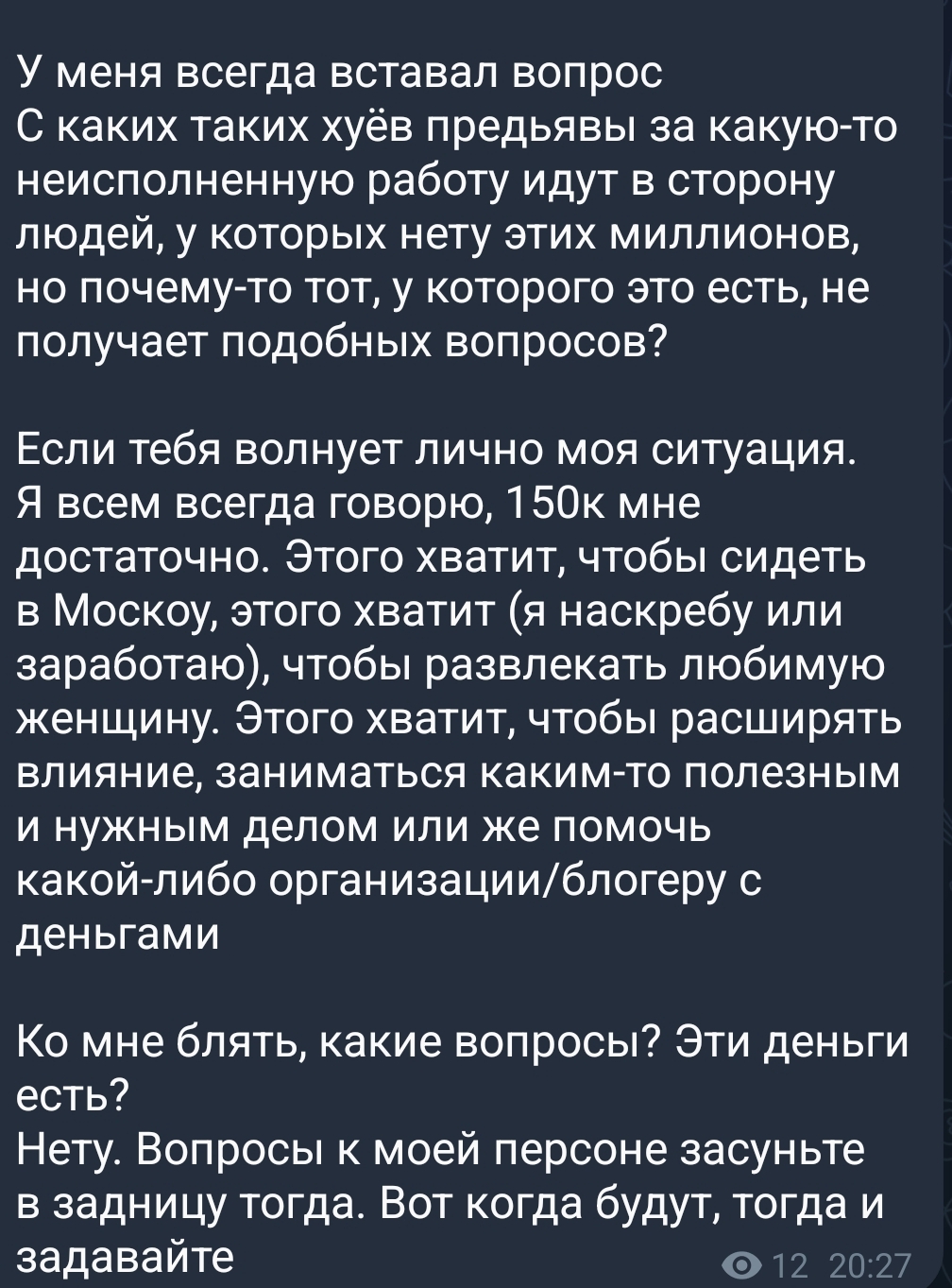 1.ты не понял мой тейк. еще раз. если жмиль уничтожен, деньги оттекают, кому? чем жмиль отличается от тех, к кому перетечет аудитория? если деньги перетекут к таким же, как жмэ, то ситуация не поменяется, понимаешь? значит, исходя из логики, если твоя финальная цель - порождение контента, то жмиль должен не просто ликвидироваться, а быть осужден аудиторией. то есть, нужна причина. Если жмиль просто исчезнет, его аудитория перетечет, но на контент это не повлияет. ведь жмэ не генерит контент на те деньги, что ему донатят, верно? поэтому я и хочу услышать от тебя причину, по которой можно отменить Жмиля. любую. то, что он не едит в ДНР - вряд ли хорошо. но настолько ли плохо, чтобы аудитория могла за это отменить? отменять за то, что человек помогает донатами, но не помгает(?) приездом в ДНР? 2. Ты делаешь видео на ютубе с разбором Жмиля. если бы ты не хотел быть услышанным, ты бы говорил об этом сам с собой. но раз ты выложил видео в интернет, то ты нуждаешься в зрителе. как минимум исходя из твоей цели "перетока капитала". я посмотрел твой ролик, а значит потенциальный зритель, как и любой посмотревший. не думал, что это нужно пояснять.