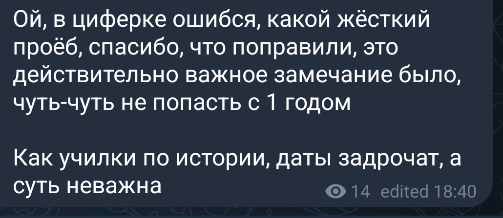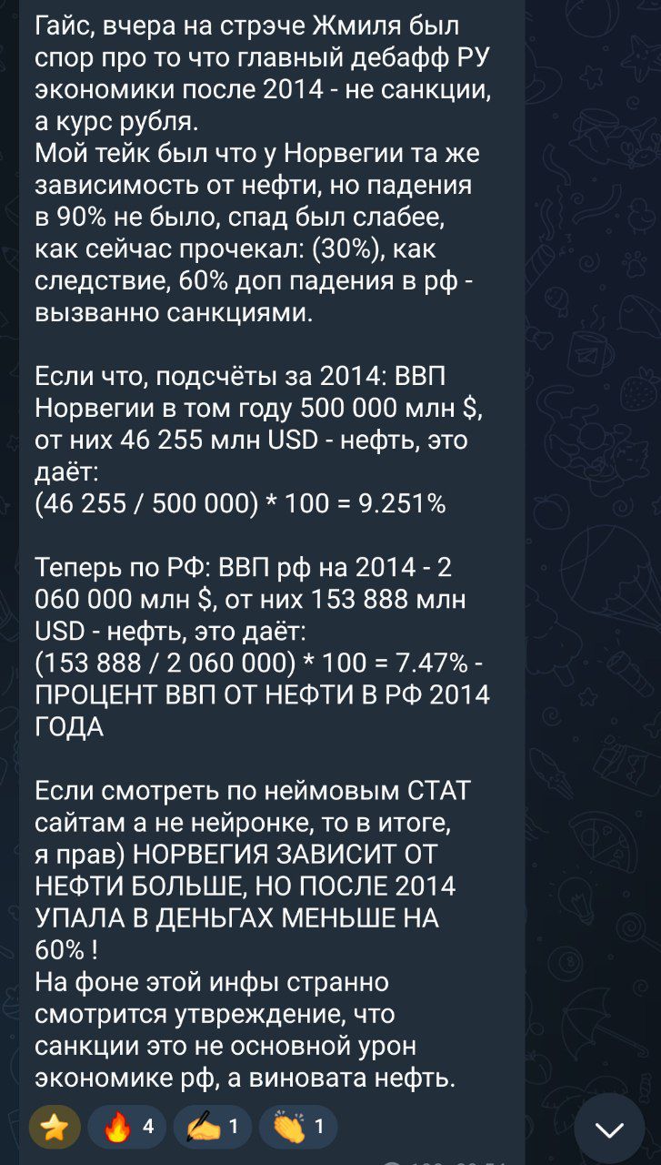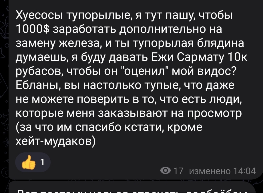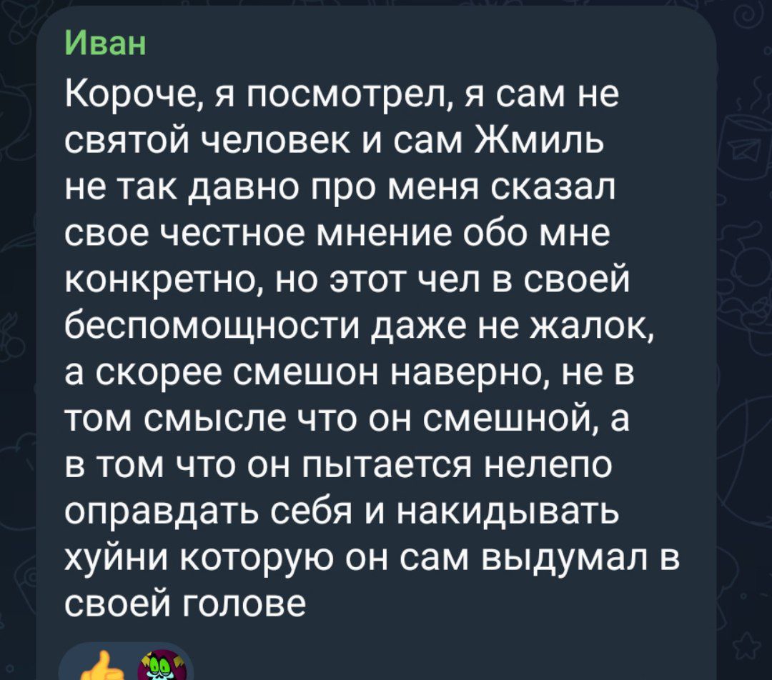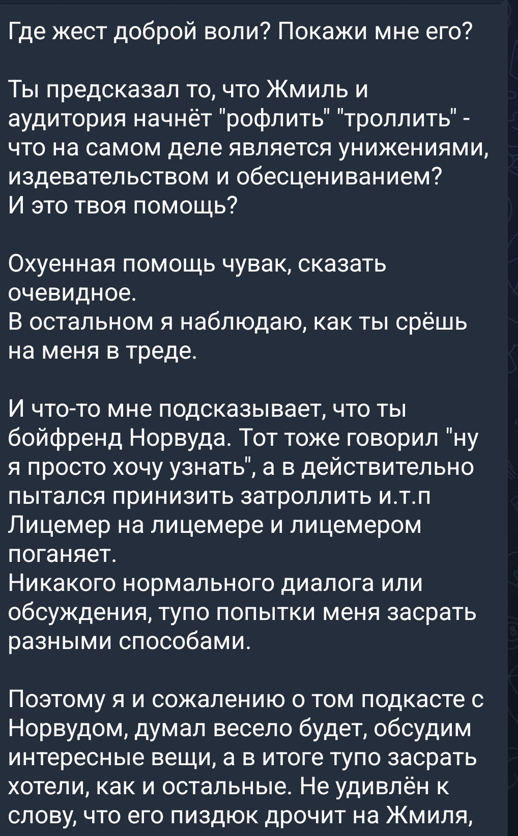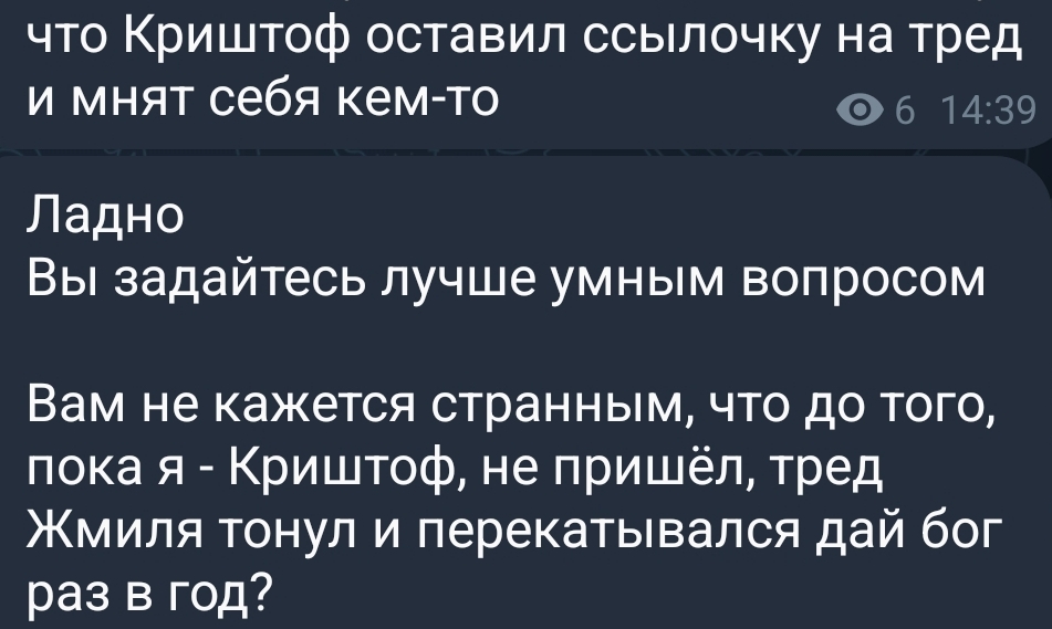 Мда. Не думал, что он в принципе может стать кому-то интересен, но вот стал интересен Жмилю. Пользуясь тем, что Жмиль читает телеграм-канал своего нового любимого блоггера, а этот блоггер туда выкладывает посты отсюда, передаю привет Жмилю. Я вас смотрю с 2019 года. Спасибо за стримы. Но ваши колёсные ауки - это казино ебаное.