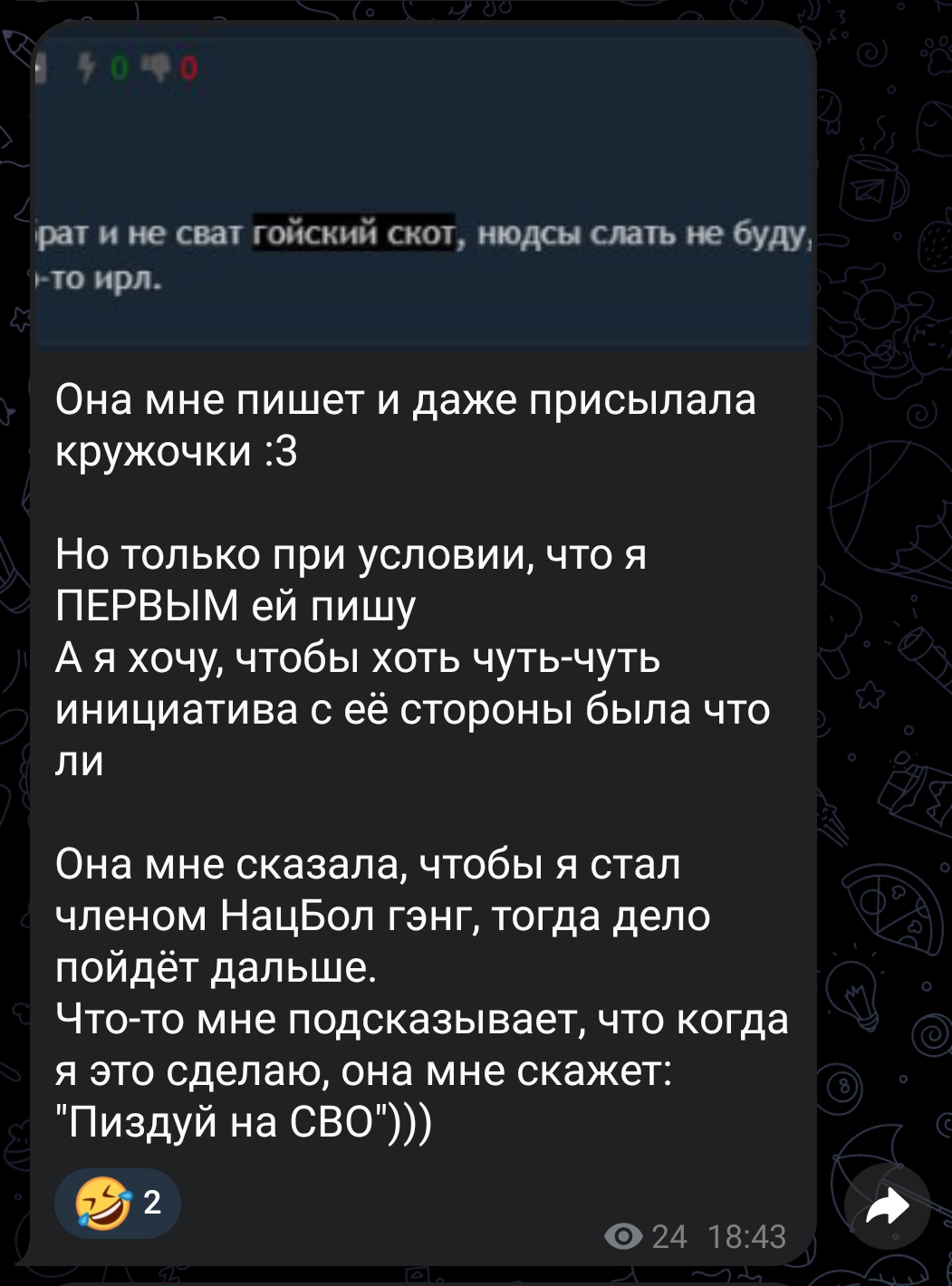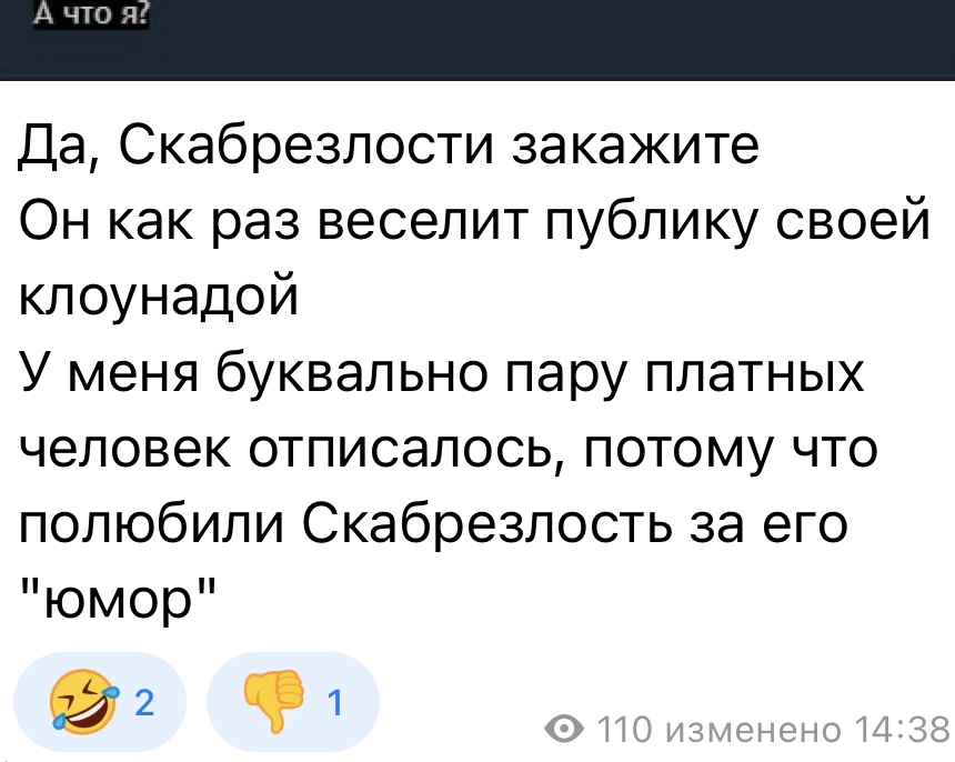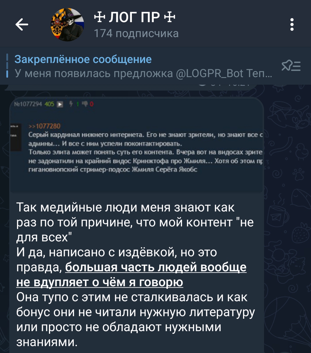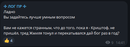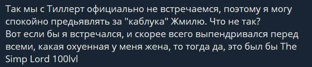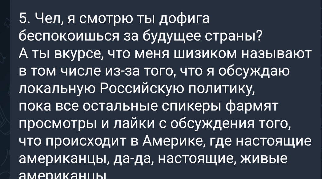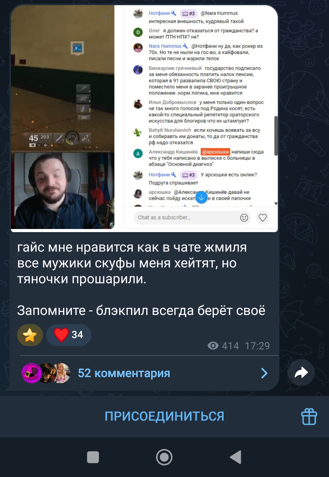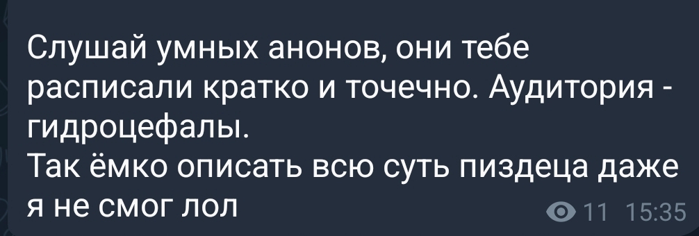 Мда. Не думал, что он в принципе может стать кому-то интересен, но вот стал интересен Жмилю. Пользуясь тем, что Жмиль читает телеграм-канал своего нового любимого блоггера, а этот блоггер туда выкладывает посты отсюда, передаю привет Жмилю. Я вас смотрю с 2019 года. Спасибо за стримы. Но ваши колёсные ауки - это казино ебаное.