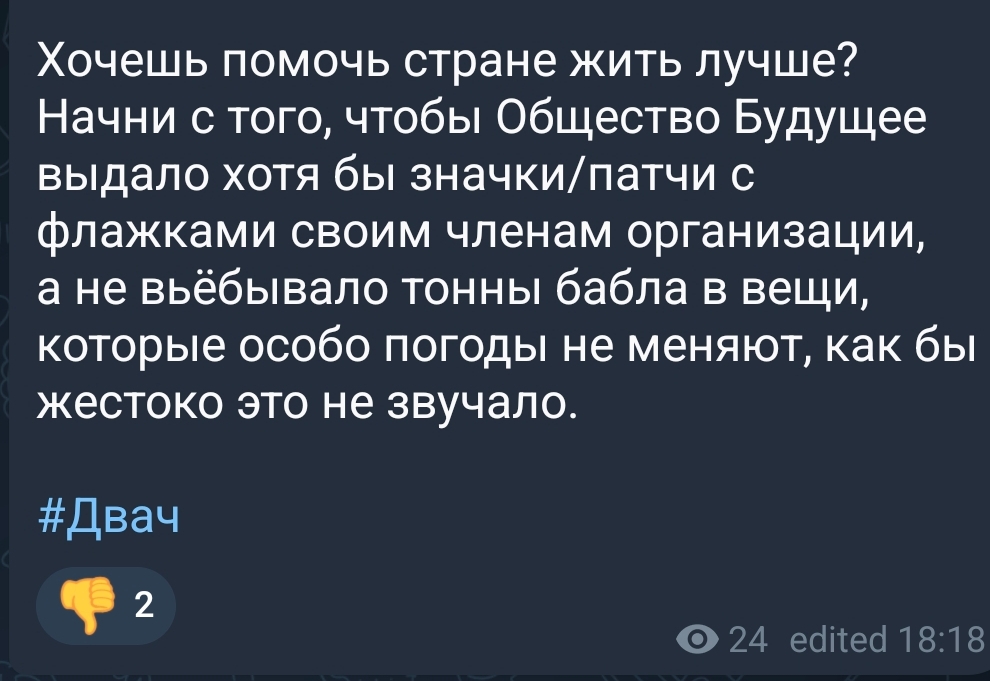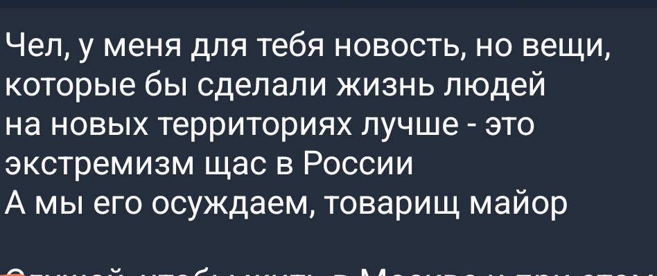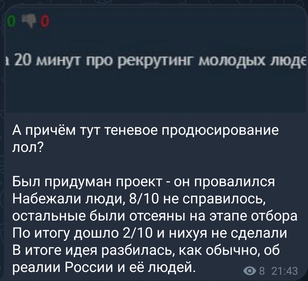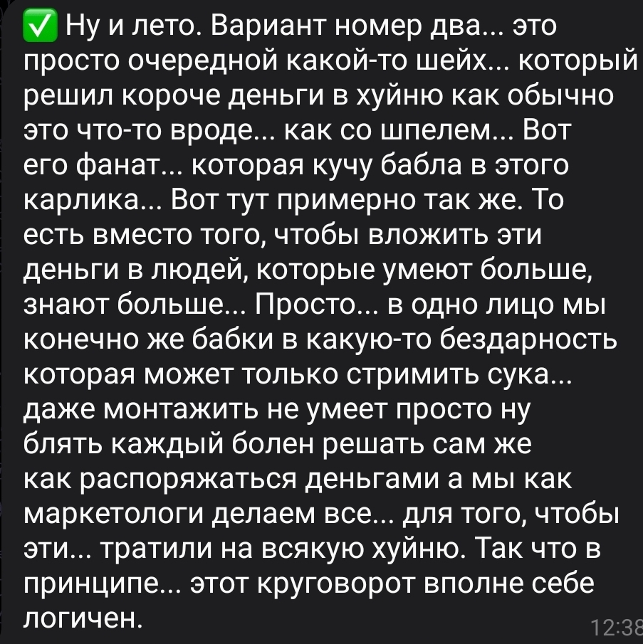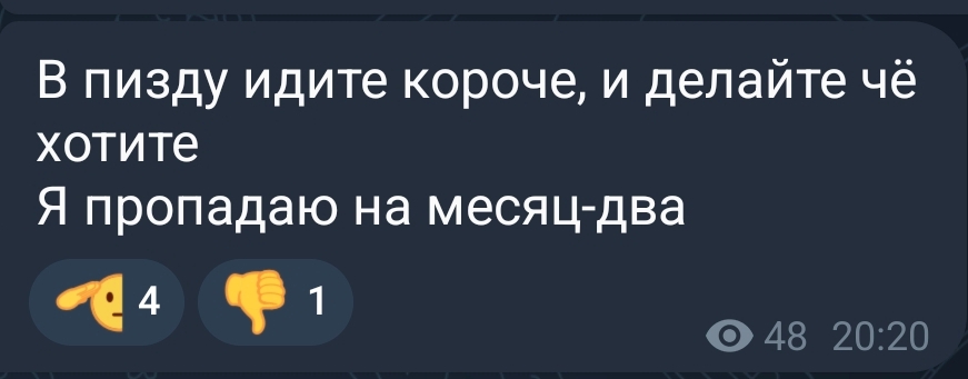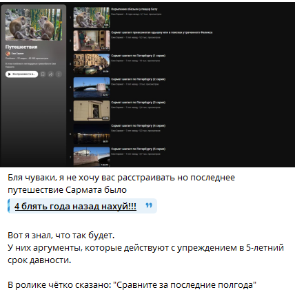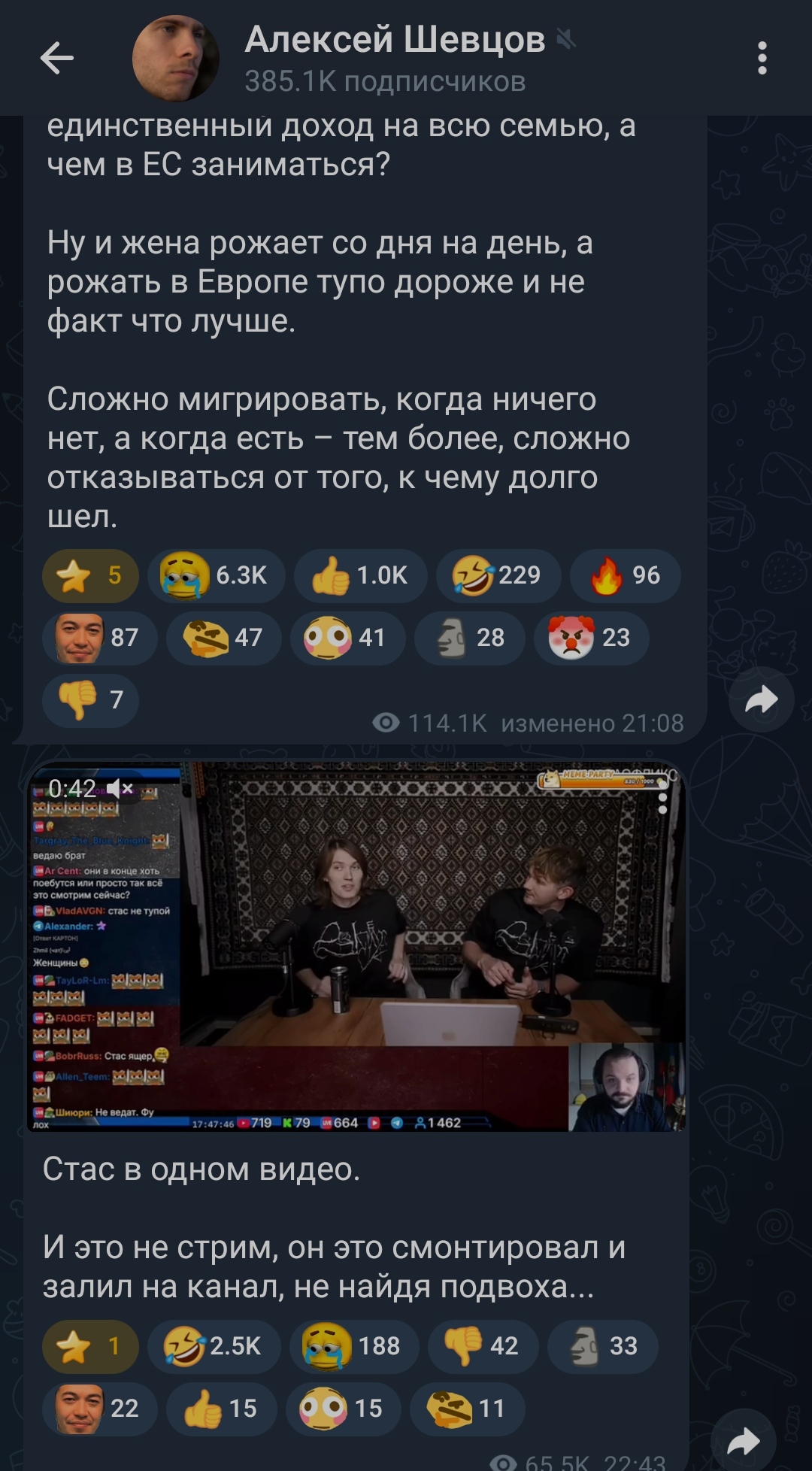 Мда. Не думал, что он в принципе может стать кому-то интересен, но вот стал интересен Жмилю. Пользуясь тем, что Жмиль читает телеграм-канал своего нового любимого блоггера, а этот блоггер туда выкладывает посты отсюда, передаю привет Жмилю. Я вас смотрю с 2019 года. Спасибо за стримы. Но ваши колёсные ауки - это казино ебаное.