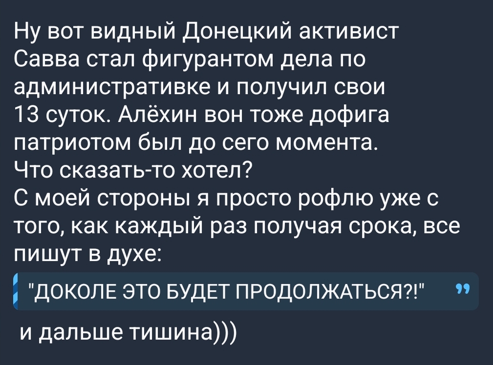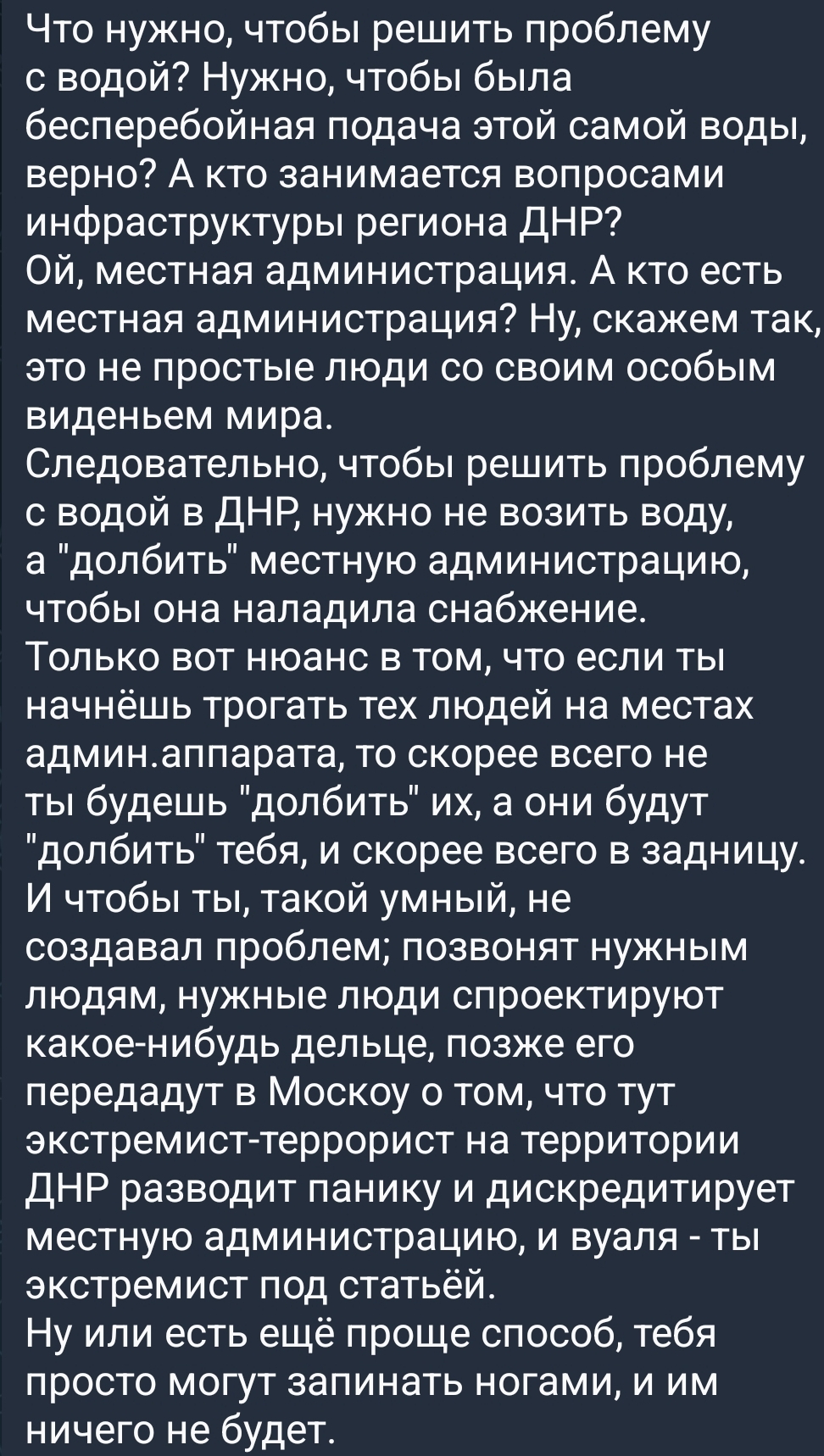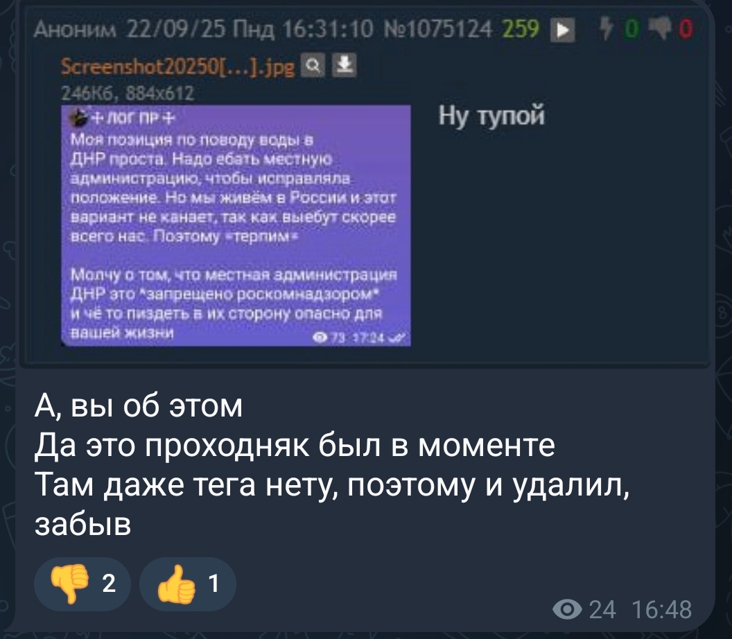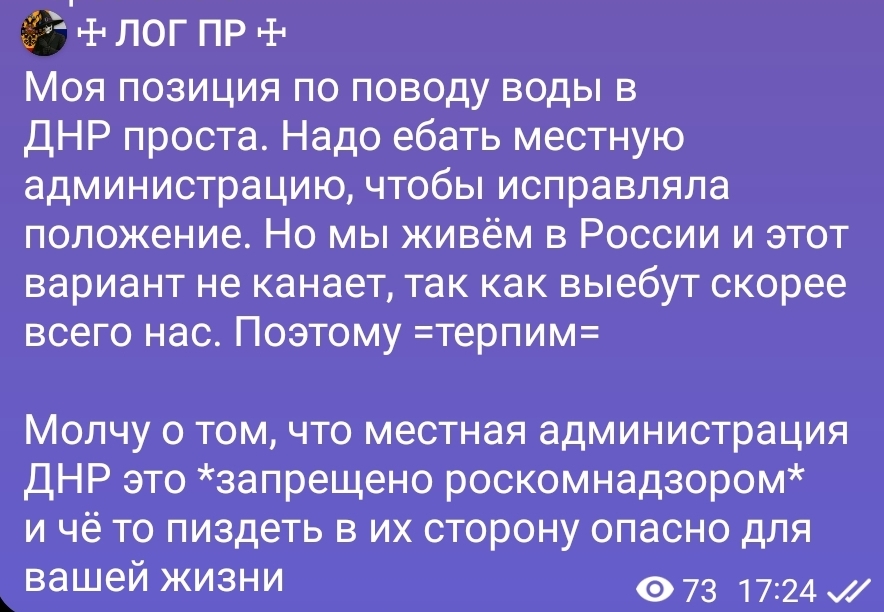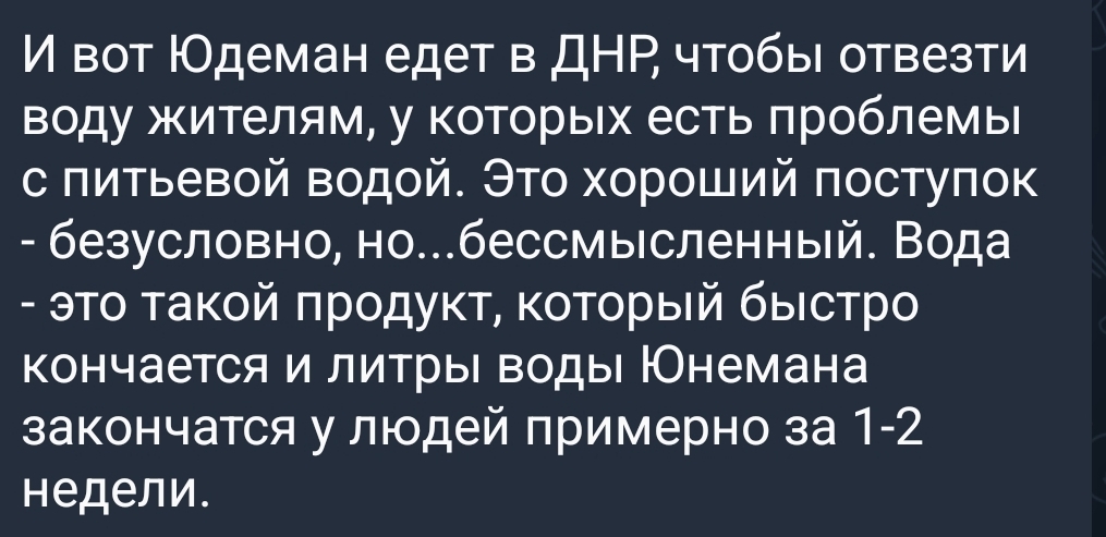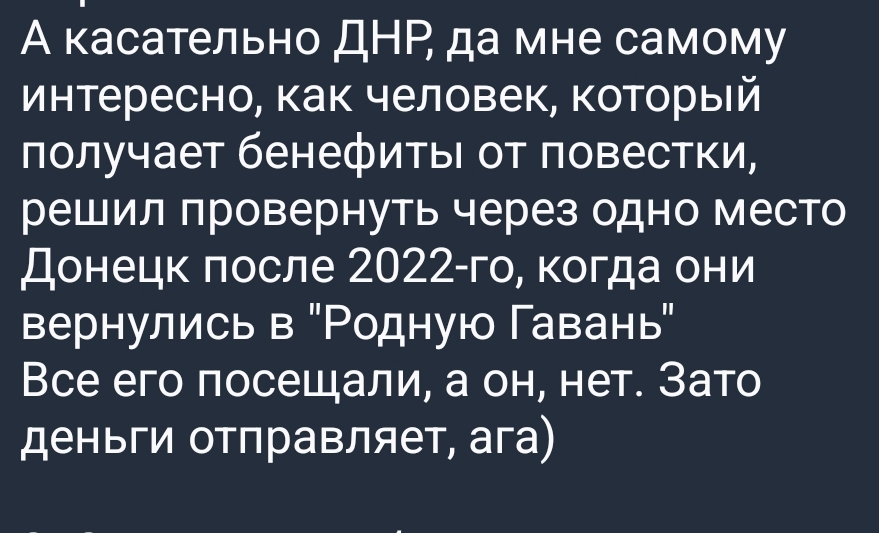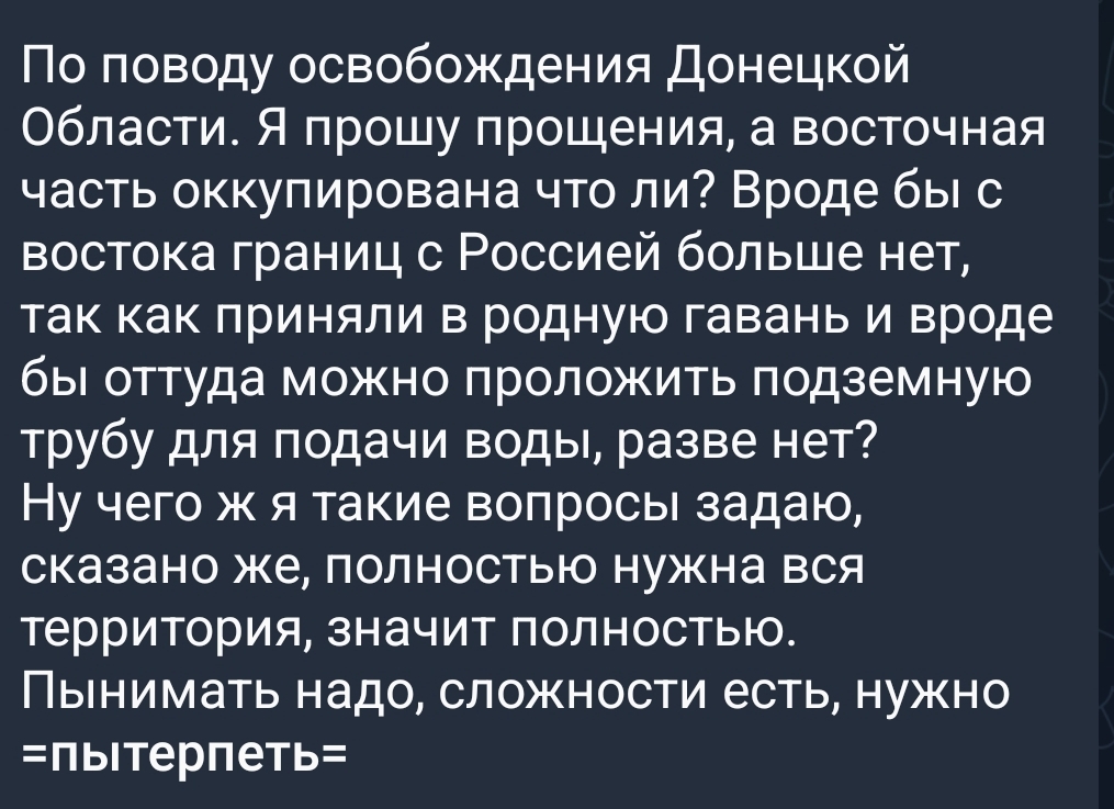 Помогите 🐎 зайти на википедию прочитать в каком году был референдум Крокодильи слезы про ЛДНР от человека который даже в датах путается Это так потешно, когда у человека в голове не дифференцируются события конца лета и сентября 2022 с мятежом Пригожина в 2023. Абсолютно нулевой интерес в современной политической жизни Собственно чего ещё ждать от человека, который предлагает Жмилю ехать в Донецк во время гуманитарной катастрофы забирать воду местных ради красивых фоточек в ВК.