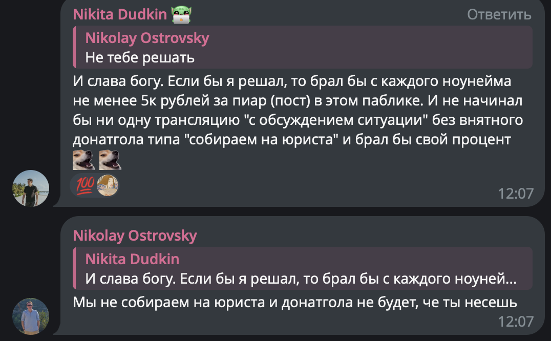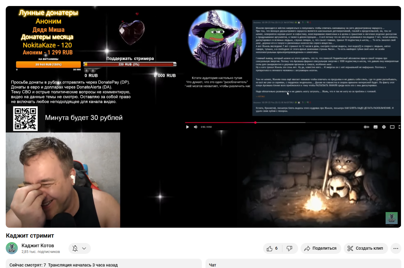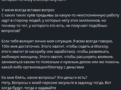 Далее про то, что он чист перед законов: предоставление развлекательных услуг на постоянной основе по предоставленному прайсу, это всё что угодно, но не прошение подаяний. Ему регулярно "донатят" в обмен на развлекательные услуги. Никаких милостыней и пожертвований здесь нет и близко.
