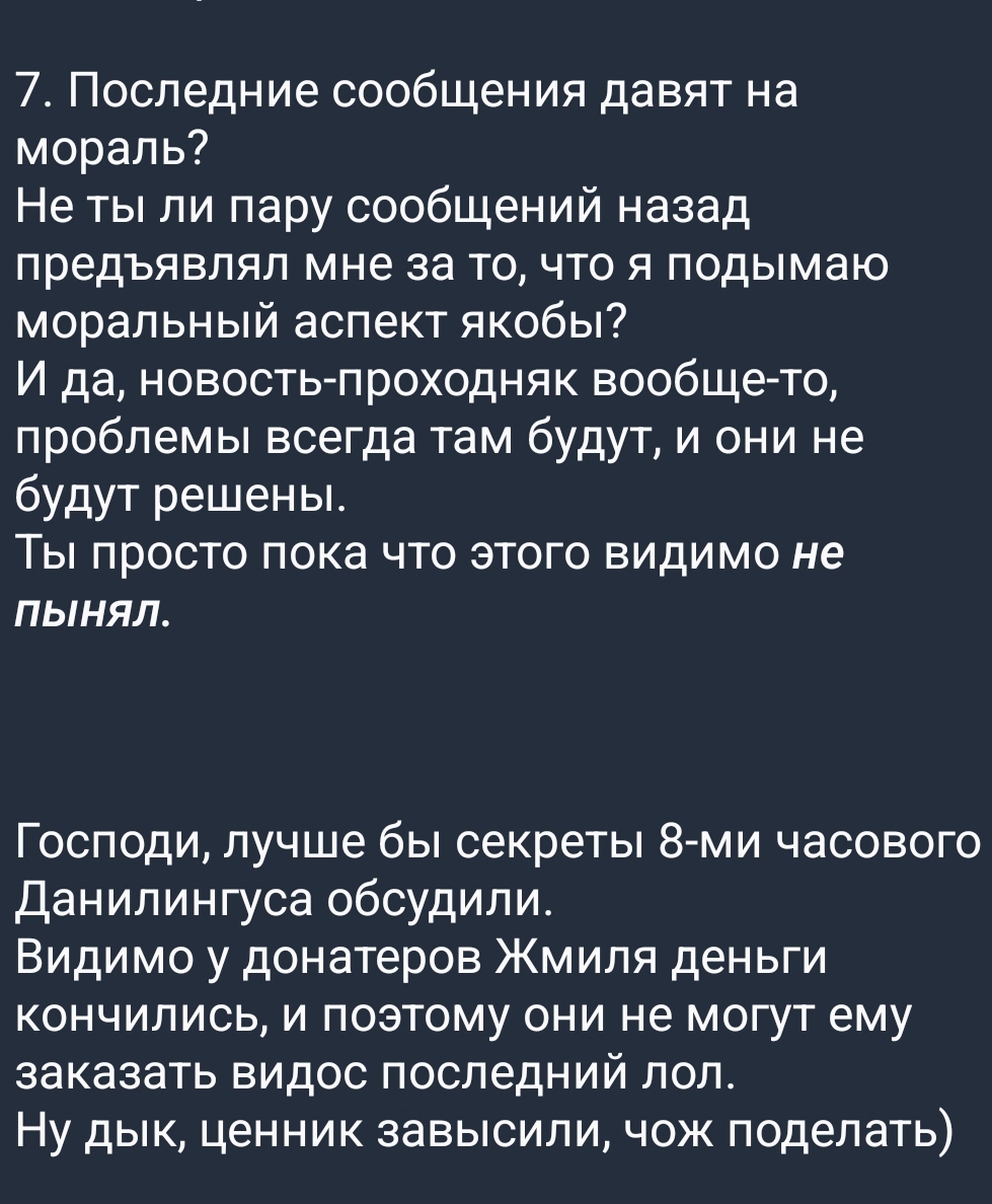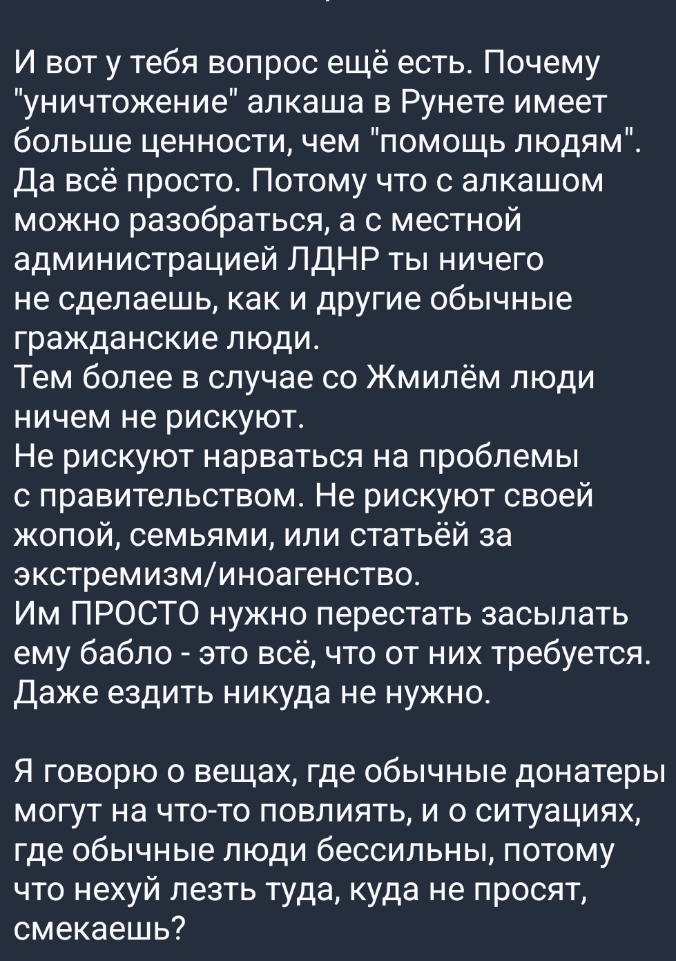 1. идеальный сценарий - Жмиль теряет бабки и они перетекают другим блогерам, которые... лучше? все эти деньги потекут к тем, кто не манипулирует? с чего ты это взял? то, что ты описал, работает и при условии, что жмиль просто помрет, например. тебе вцелом плевать на причину, по которой его перестанут смотреть. тогда еще важнее объяснить, каким образом твой видос, про то, что Жмэ не едет в ДНР могло хотя бы в теории привести к глобальному оттоку капитала. иначе с таким же успехом можно было просто видос записать, в котором ты проклинаешь жмиля на банкротство донатеров, лул 2. "Я хочу потому что могу" А потом ты говоришь, что аудитория Жмиля не обладает логикой? Зачем мне или еще кому- либо тебя смотреть, если ты делаешь видео, только потому что можешь? если труд не подкреплен ничем, то он и ничего не стоит. и я на это должен обменять Жмиля с его , пусть и спорной, но все же структурированной позицией по многим вопросам? его большинство смотрят и уважают как раз за то, что все, что он говорит, он сам же может и обосновать.