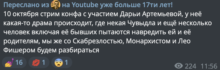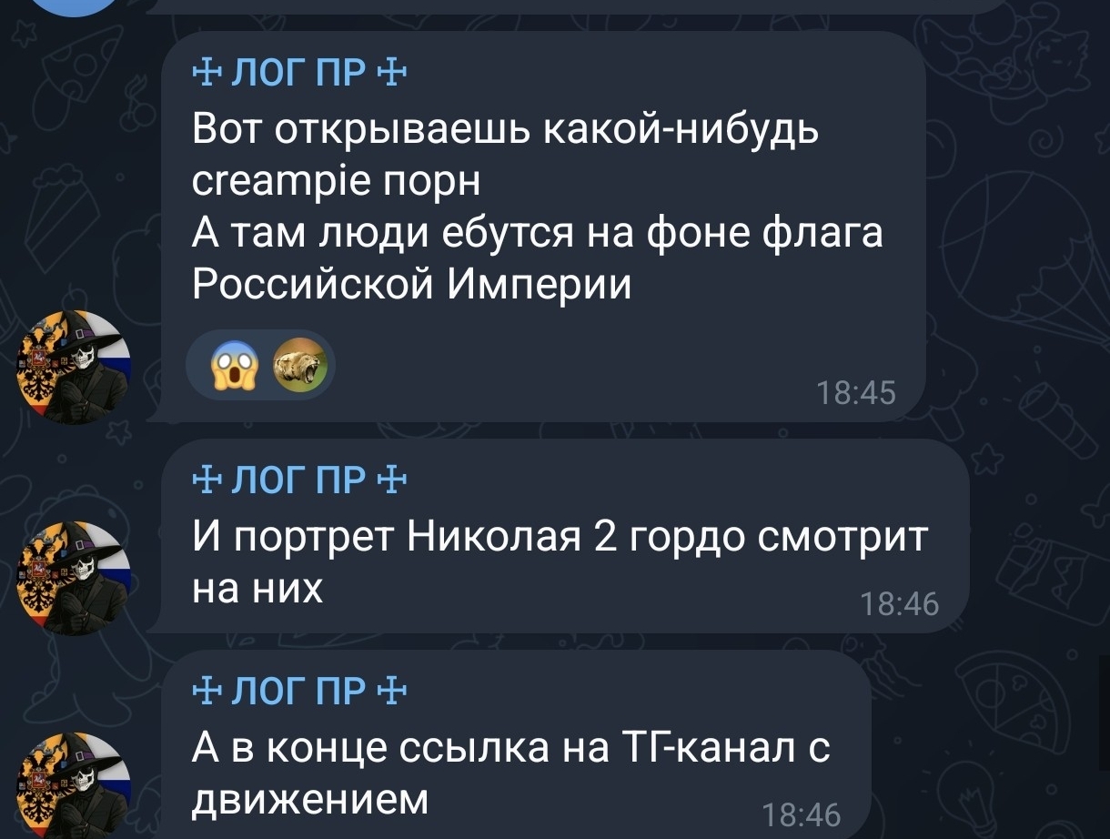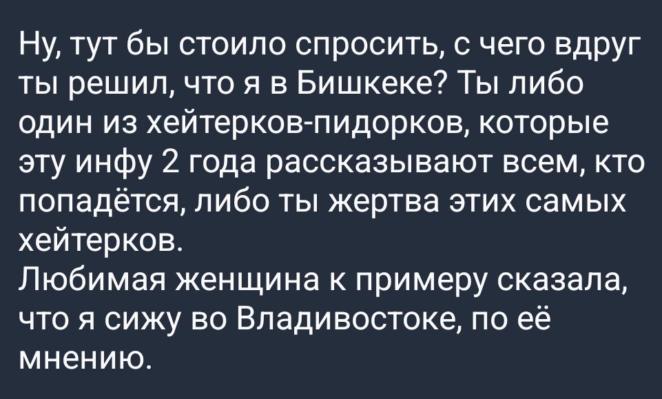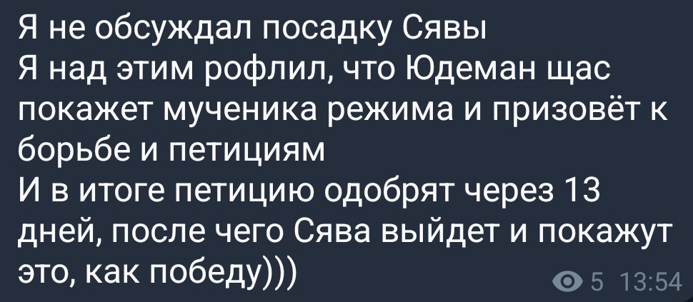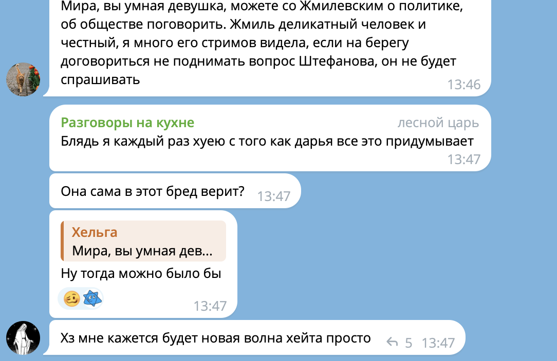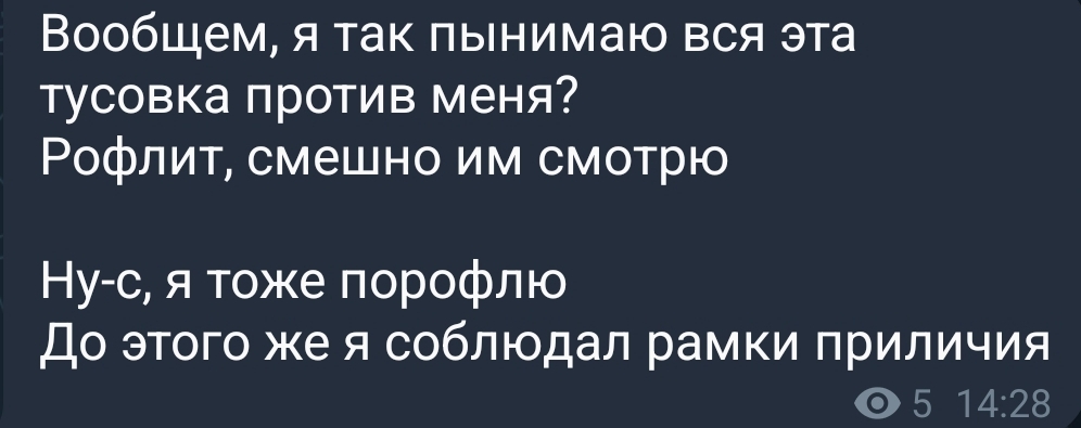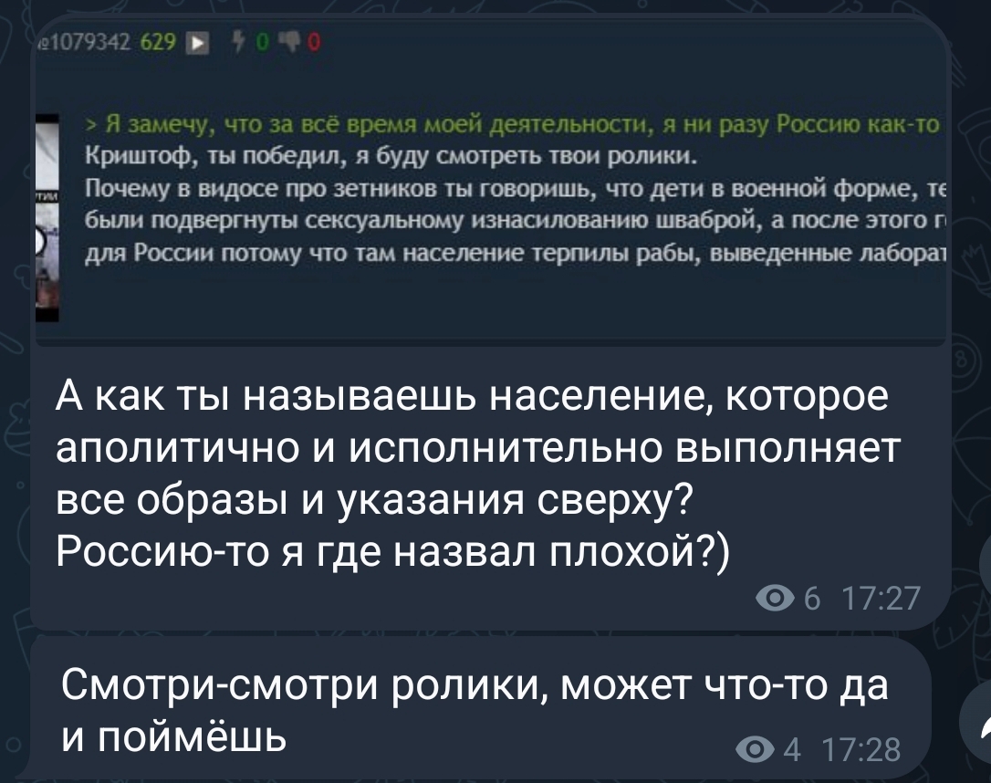 Напоследок хочу сообщить, что готов пообщаться с вами на равных в рамках лайв-формата, обсудить ваши взгляды без духоты и оскорблений. Если готовы продолжить — обращайтесь по контактам канала. Удачи!