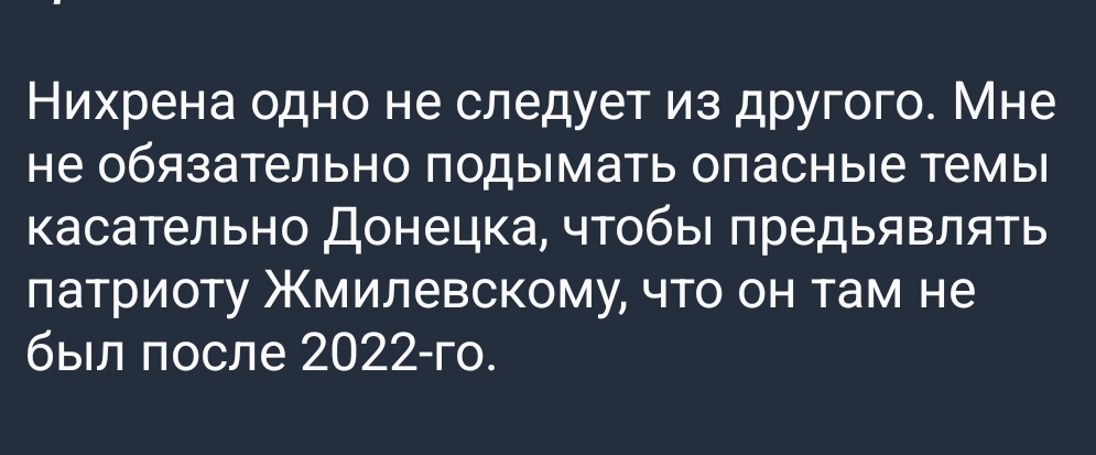 "Скажи это аудитории Жмилевского хахахах Я как-то попробовал им объяснить, что "у них есть выбор не донатить Жмилю" Так они меня сразу завистником окрестили"