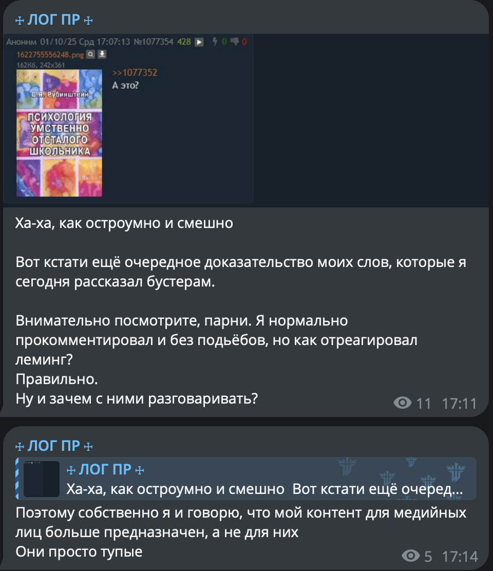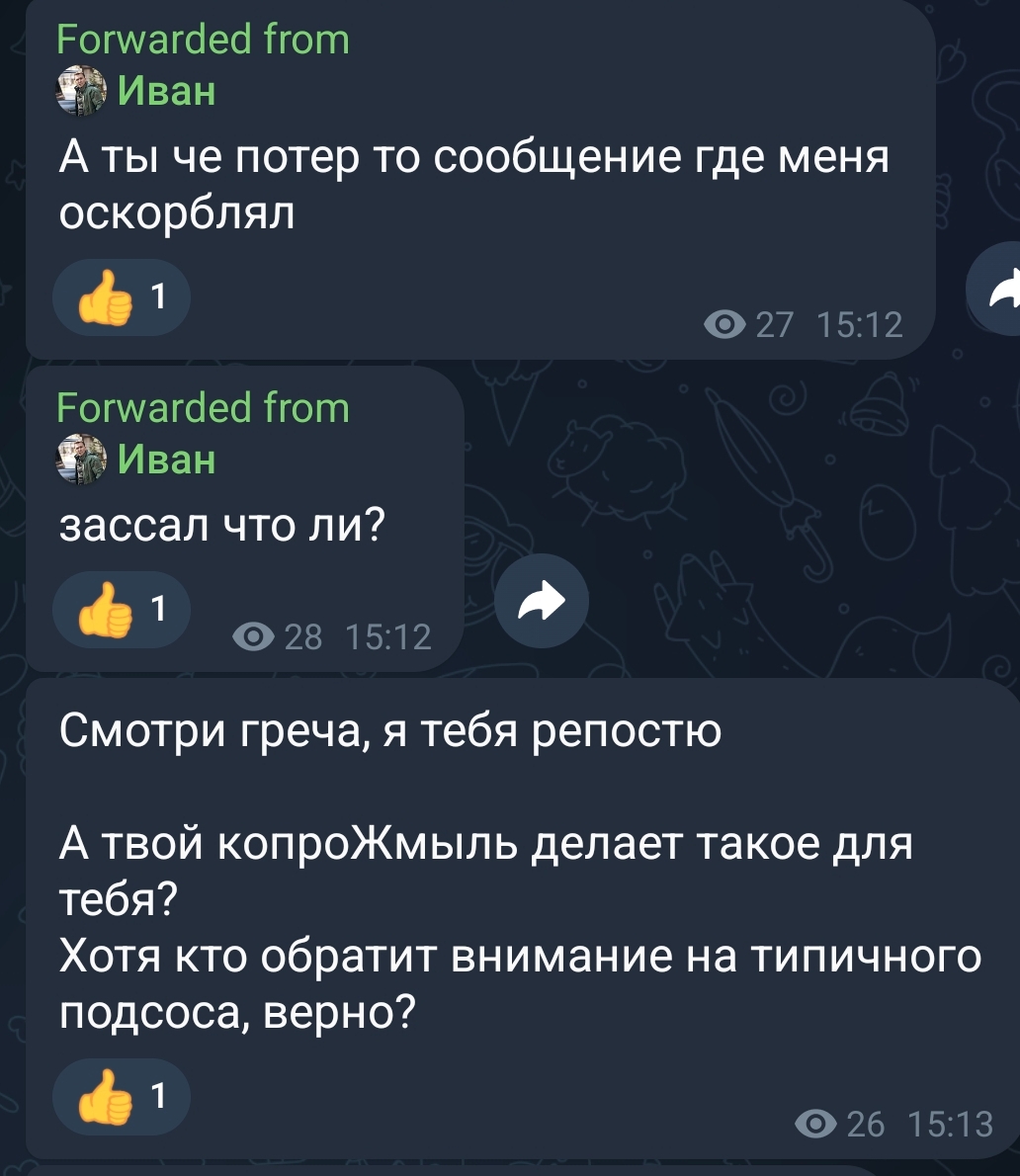 >"Я ещё в видосе про Юнемана сказал: "Юдеман не ответит, у нас карт-бланш"" А ещё в видосе ты говорил о том, что причиной для снятия ролика послужила блокировка тебя на его ресурсах. Я понимаю, что беды с головой мешают запоминать даже содержание своих роликов, но не даром придумали такие прекрасную вещь как блокнот, пользуйся. >"Может потому что я смотрел Жмиля, а потом перестал?" Смотрел, а после тебе Жмиль сказал что-то не очень лицеприятное и ты такой "УХ ЖМИЛЬ ПЛОХОЙ, УХ НЕГОДЯЙ!". Я просто уверен в этом на 99.9%, что это окажется таковым. Действительность это наглядно подтверждает. >"Жмиль не вернётся пахать учителем, это старая байка всех успешных блогеров/стримеров" Вернётся или же нет, откровенно меня это крайне мало волнует. К счастью, Я - это не ты, кто вечно недовольным лицом пытается залезать в чужой шкаф или карман с целью обгаживания людей без каких-либо на то причин. Хотя даже если причины и есть, я не настолько бесчестен, чтобы не суметь это высказать прямо в лицо своему оппоненту. >"Попытка поставить меня на один уровень с Маргиналом была хорошей, но тупой" Ирония кроется в том, что я и не пытался поставить тебя прям на уровень с ним, я просто констатировал факт об ваших общих чертах - не более. И тот факт, что ты не считаешь себя и марго шизами, показывает лишь твою последовательность в этом моменте, однако как я говорил ранее для большинства вы - шизы и пока что, увы, но вы не хотите хоть как-то это менять. >"Кто смотрит меня долгое время, на такую херню не поведётся." Мне абсолютно всё равно поведутся они или нет. Эти комментарии адресованы не им, а лично тебе, шиз, а твоя аудитория пускай делает с этим всё что хочет. >"Заметь, ходячая ты тупость" Шиз, я тебе говорил уже многократно. Не тебе заикаться об интеллекте. Судя по давним комментариям, ты ещё с прошлого канала не желал как-то меняться и прогрессировать. Даже я - крайне ленивый человек смог найти в себе силы перебороть себя и начать работать. В свою очередь ты же буквально занимаешься псевдоинтеллектуальной деятельностью с невероятно убогой целью - сделать себя "важным". Только вот есть одна проблема - Мир не станет слушать бред человека, неспособного хоть как-то отстоять свою позицию. И я говорю даже не о сливе с разговоров со Жмилём и Мраком. Я говорю о банальнейшей неспособности с помощью конструктивного диалога, доказывать даже в своём жалком тг-канале, где ты пытаешься вечно задеть бедного Жмилевского, переходя на его личность и уличая в том, что ты не смог и навряд ли сможешь как-то маломальски доказать, как-будто ему не похрен и он сидя на стриме думает "Блин, как же там Криштоф со своими видосами?", либо же пытаясь как всегда худо-бедно давать ответы, а что-то неудобное называть чем-то "неправильным" или вовсе игнорить - это видимо тот самый пример сильного человека способного за себя постоять, да? Хотя точно я это выдумал и ты ни разу такого не говорил.. Мне просто не дано понять, как можно быть настолько бездарной чернью и бояться даже после того, как подавляющее большинство (и даже те на кого ты возлагал надежды) сказали или намекнули на то, что с тобой что-то не так, продолжать гнуть свою бредовую, а главное ничем не подкреплённую(Кроме твоего низкосортного высокомерия) позицию?
