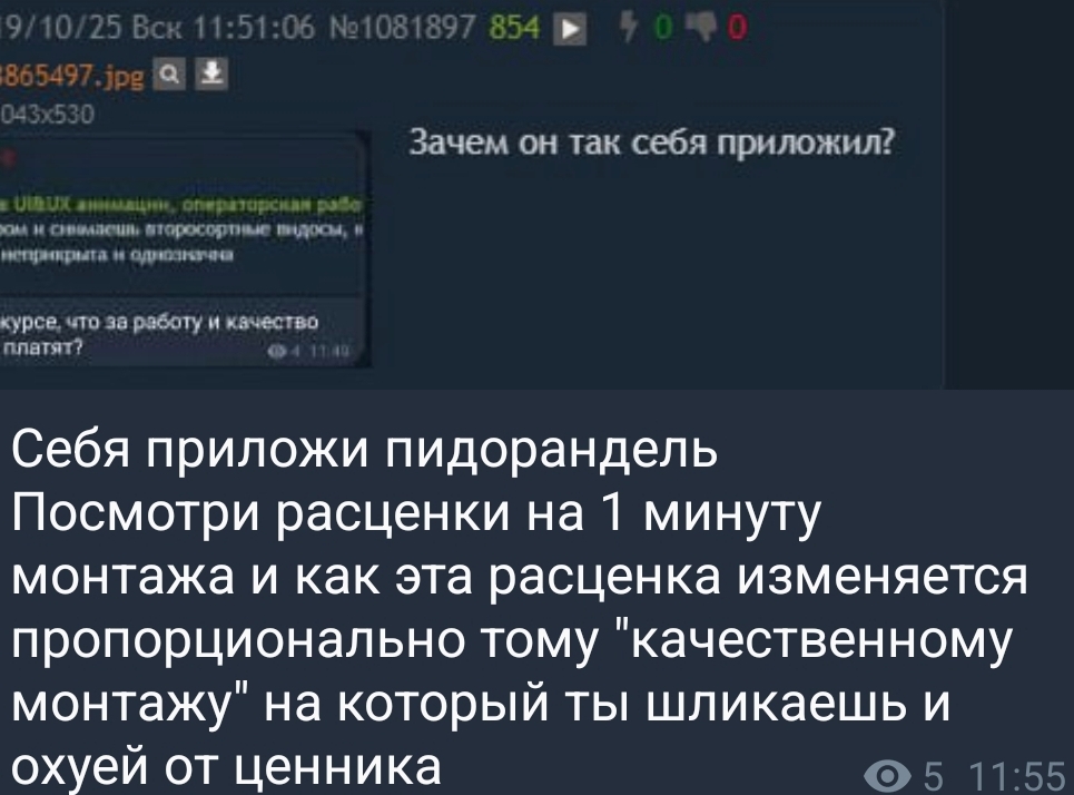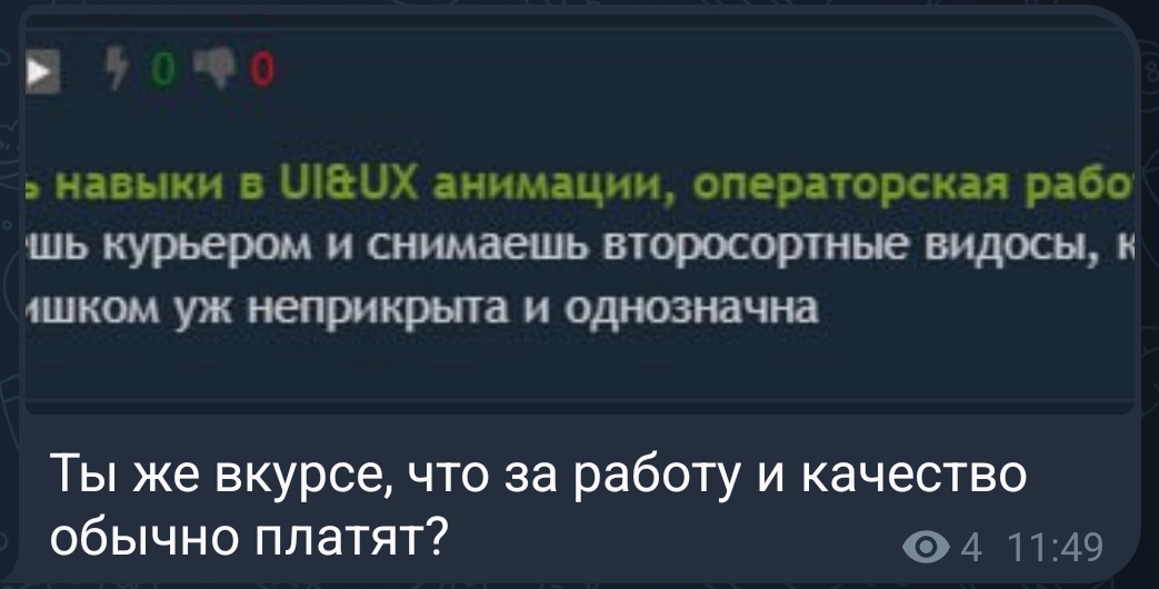 Привести настолько тупой ответ, это надо уметь... Я тебе прямым текстом пишу "И даже имея все эти навыки ты работаешь курьером и снимаешь второсортные видосы, которые делаются за час..." Ты возможно не в курсе, но МОНТАЖЁРОМ МОЖНО РАБОТАТЬ И ПОЛУЧАТЬ ЗА ЭТО ДЕНЬГИ(При чём довольно неплохие), точно также как и аниматором или кем-либо ещё, но, увы, у тебя на деле таких навыков просто нет, что наглядно видно по твоим роликам в открытом доступе и единственное ради чего это вкидывается - ПОПЫТКА ПРЕДАТЬ СВОИМ СЛОВАМ ХОТЬ КАКОЙ-ТО ВЕС, но как я писал до этого на тебя как было подавляющему большинству, как ты выразился "МУХ" было всё равно, так и будет.