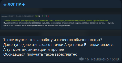 >А ещё монтажёр, фото-ретушер, есть навыки в UI&UX анимации, операторская работа, работа с public relations И даже имея все эти навыки ты работаешь курьером и снимаешь второсортные видосы, которые делаются за час... Научись врать естественнее, твоя ложь прям слишком уж неприкрыта и однозначна