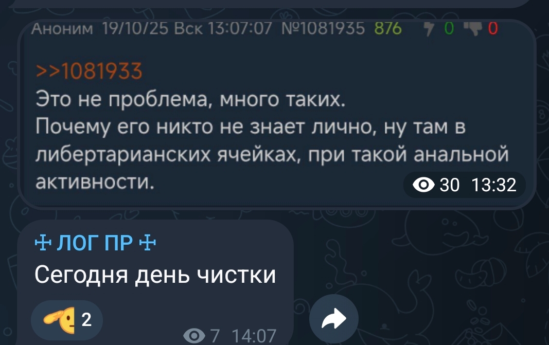 1. Про лицемера пишет тот чел, который вчера обиделся и выкладывал свои пьяные голосовые, где ты нес такую хуйню ебаную. Какие нацболы тебя примут, тебе они самому ебальник набьют, ничтожество ебучее, которое нихуя не может и пиздит идеи у других. 2. По-моему терпишь только ты, когда всех банишь в предложке, хуила позорная и здесь ты тоже терпишь то, как тебя хуесосят. Хули ты воздух пинаешь, долбоеб, вчера ты уже шизу словил, разговаривая с кем то на ты? Ебало то себе не разбил, пока эти голосовые высирал?