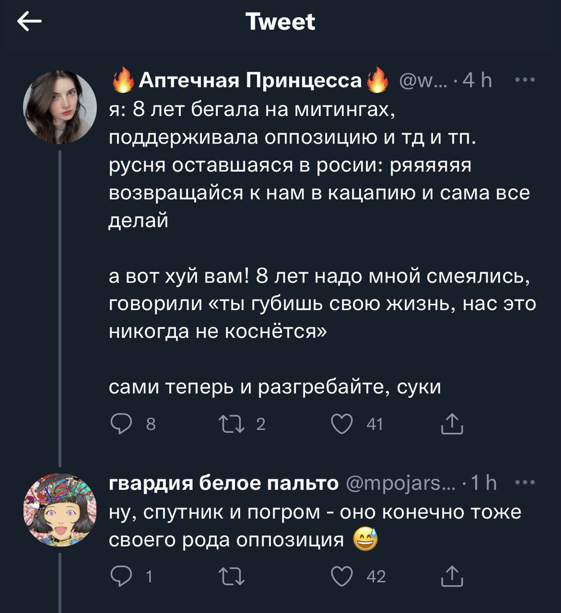 >>1081499 >"Не, много вопросов к Путину у меня, но вот эти люди - это враги >России" Абсолютно "невыдуманная" цитата из головы... >Сам он, разумеется, отрицает что у него есть стоп-темы, >утверждая: "я не буду молчать, если происходит какой-то пиздец. >Хоть что со мной будет! Я выскажусь!" А он не высказывался в этих моментах? Вот вроде либералы большим умом не наделены, но даже они подмечают, что в плане риторики Жмиль ходит "по-тонкому льду". Потому крайне сомнительные тейки, но как бы то ни было, они всё ещё имеют вероятность на существование, но пока что по стримам и по риторике которая особо и не меняется на протяжении долгого времени, звучит это всё крайне сомнительно