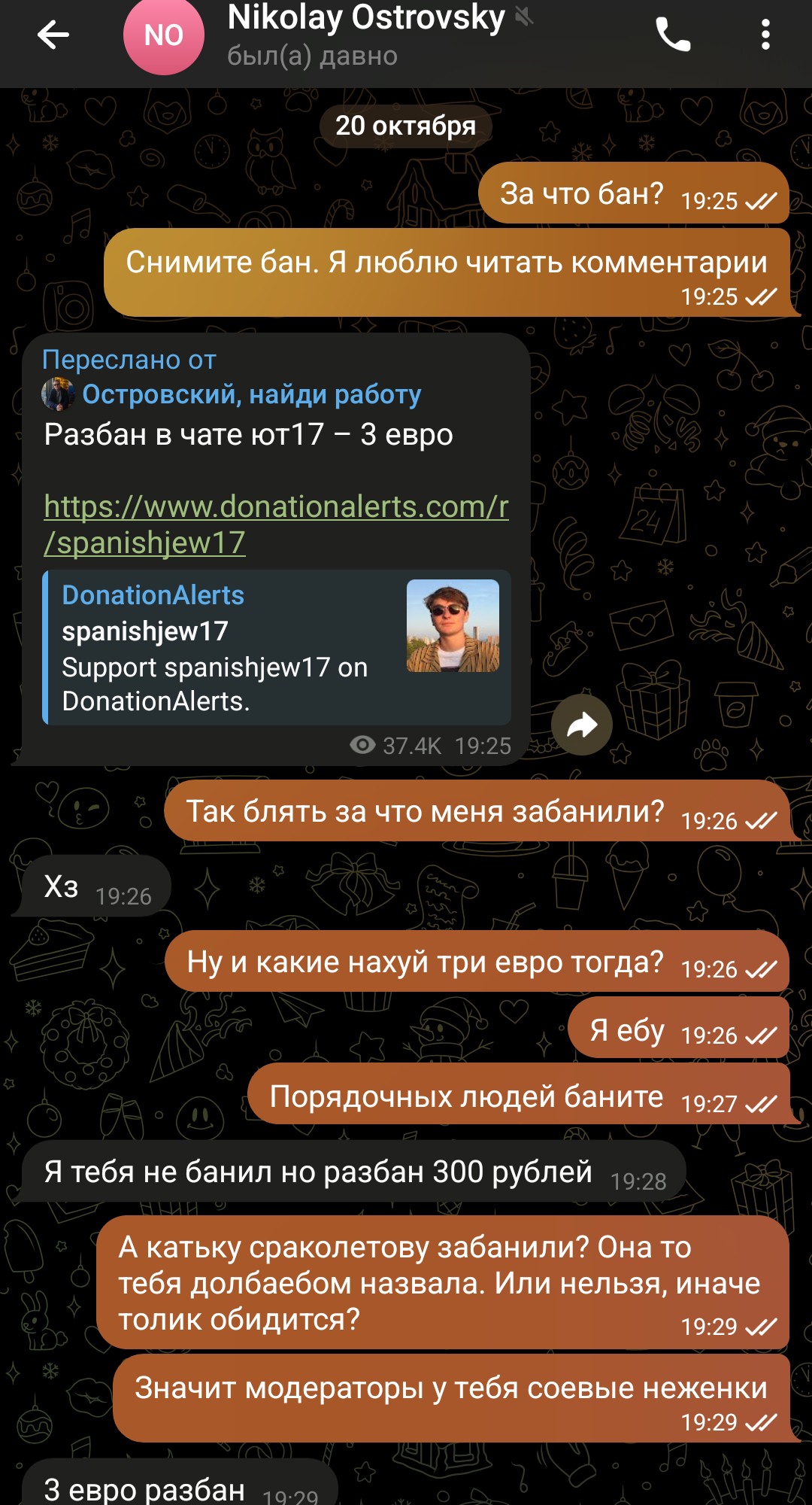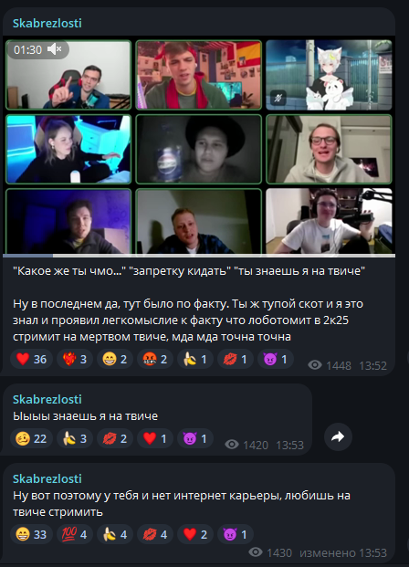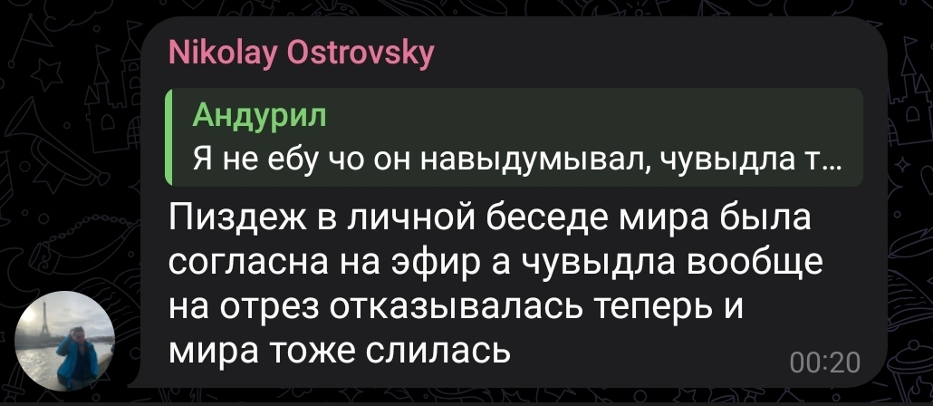 Еврейский шизофреник островский и руснявый дегенерат Остапов анонсировали стрим с Чувыдлой и Мирой Остролист, на который они не соглашались. В ответ на это Мира выложила переписку, где однозначно писала, что на стрим с конфой и Дарьей Артемьевой она не придет. В ответ на это смоленская свинья подняла визг, что его ЛиЧнУю ПиРиПиСьКу слили, а островский на кой то хуй начал пиздеть, что договоренности были.