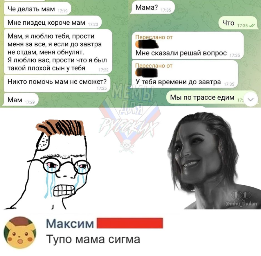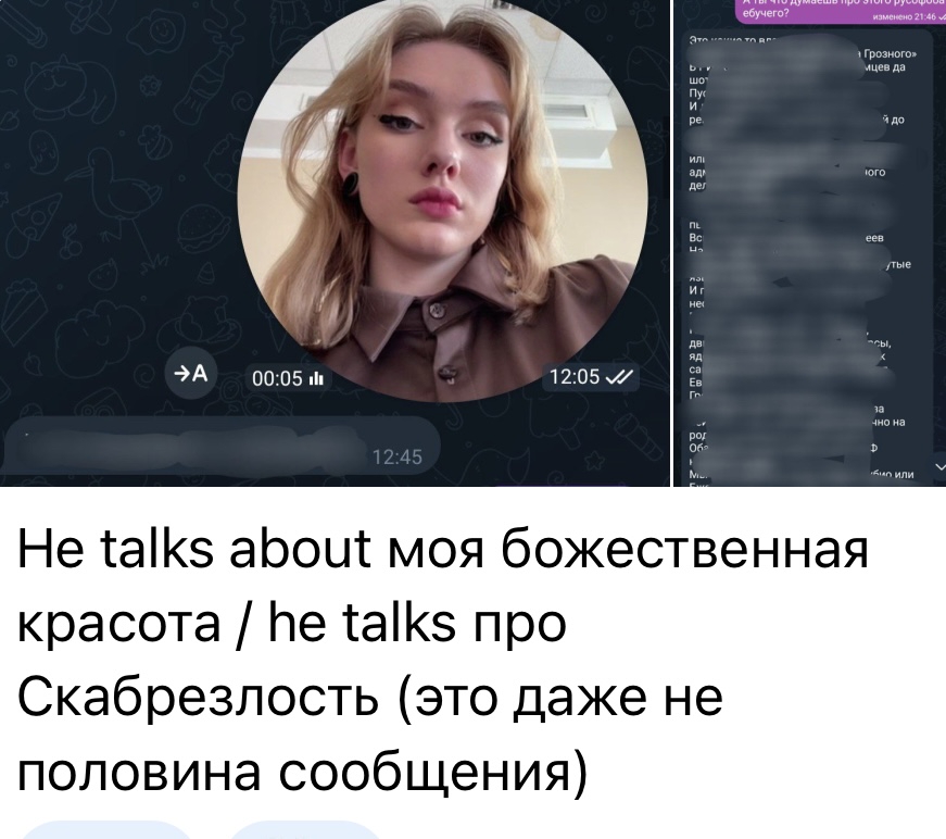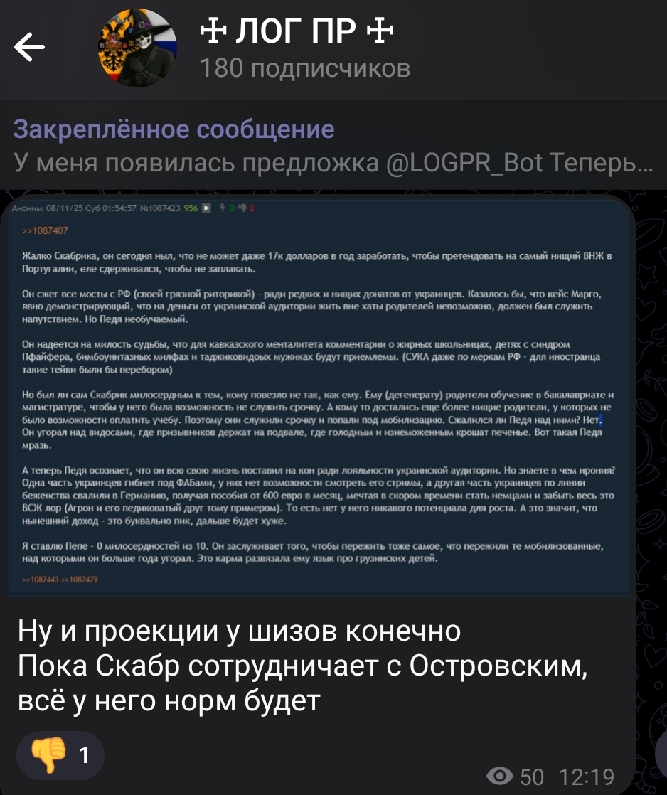 Вигелакнтов погромщиков координируют местные оппозиционные депутаты и те, кто сейчас воюют в Украине, поэтому нужно достучаться до них, а не до ментов. (Я уже заказал озвучку перевода его тейков на грузинский язык) Он сам себе задонатил вопрос про синдром Пфайфера у грузинских детей - это можно отследить, увидев списание с его карты в момент, когда к нему залетел донат. Скиньте Островскому @yt17gothgf_bot три видоса, где засирает грузинских детей, грузинских баб, и чмошных таджиковидоых грузинских мужиков. + мем про терпильность Скабрика.