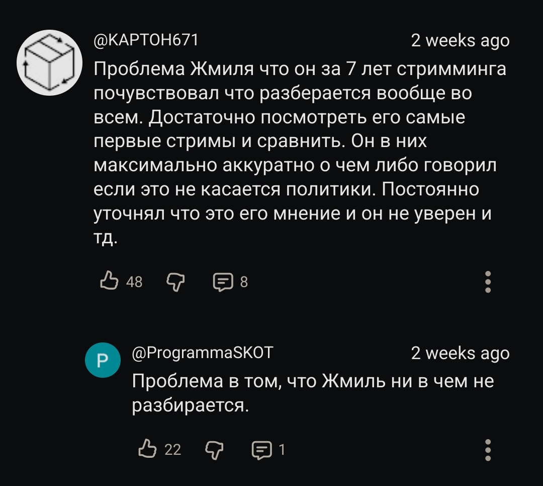 Какой же он ламповый был до гойды. Очень скучаю по старому, догойдовскому жмилю. В 2019 я его начал смотреть из-за записей лекций, стабильно смотрел разные хайлайты. А начиная с 2022 стал всё реже и реже смотреть. Безостановочные новости, шизоварики и тд