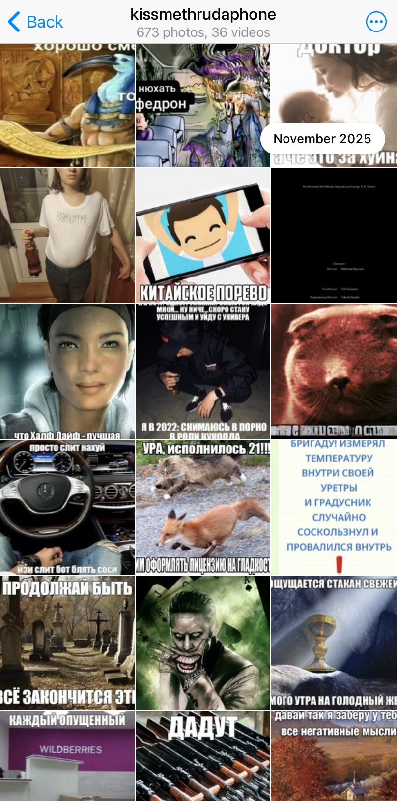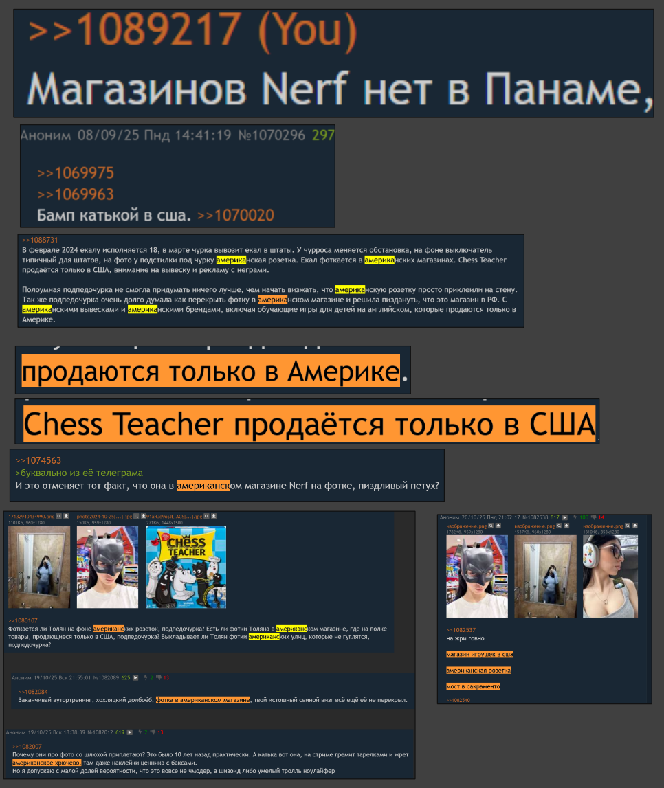 Подпедочурка не может перекрыть фотки конца 2024, которые сделаны в доме родителей в волгограде, кота в ноябре 2024, когда петух уже как год беспруфно кукарекал про сша. Ну и конечно же не может объяснить почему нет ни одной фотки из сша у шлюхи, которая изо всех сил форсит что она в сша.