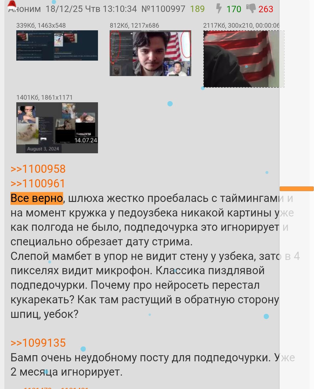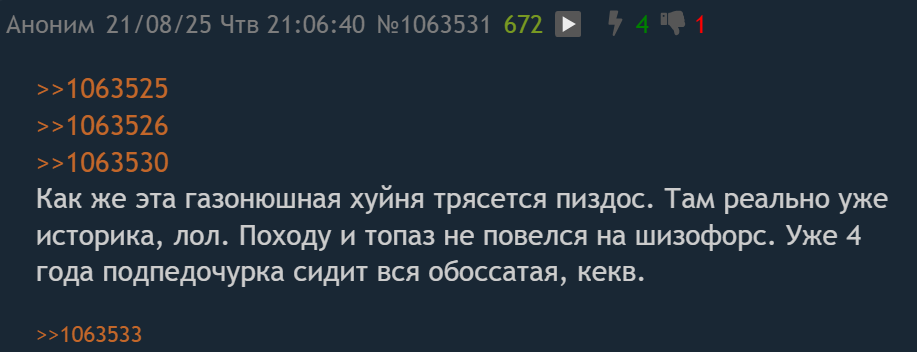 Аноны всегда угарали над нищим инцелом узбеком куколдом, которого Екал разводит на бабки на расстоянии и никто не подрывался и не перекрывал "вреееетии" и не срал шизой про "жену в сша". Подпедочурка пришел где-то в 2024. Особенно активно стал перекрывать в апреле 2025, когда вышел видос Кекуса на пол ляма просмотров, обоссывающий форс узбека.