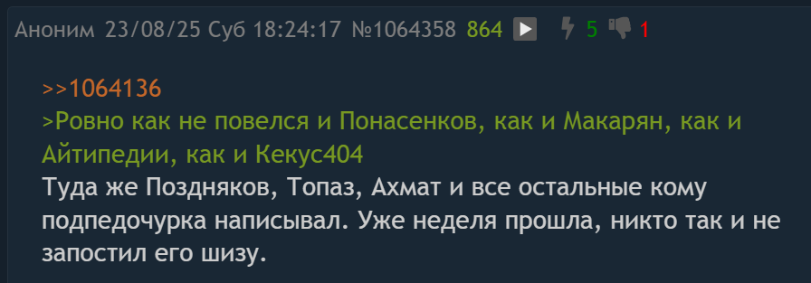 > газонюх-подпедочурка То есть макарян, кекус, аудиорв, понасенков, айтипедии это газонюхи-подпедочурки маргинала? Как раз ты форсишь то же самое, что форсят газонюхи подпедочурки с модерками на ресурсах узбека. Если в срикере написать то, что здесь пишут хейтеры, то тут же дадут пермач. А за форс шизы про жену дадут медаль почетного газонюха.
