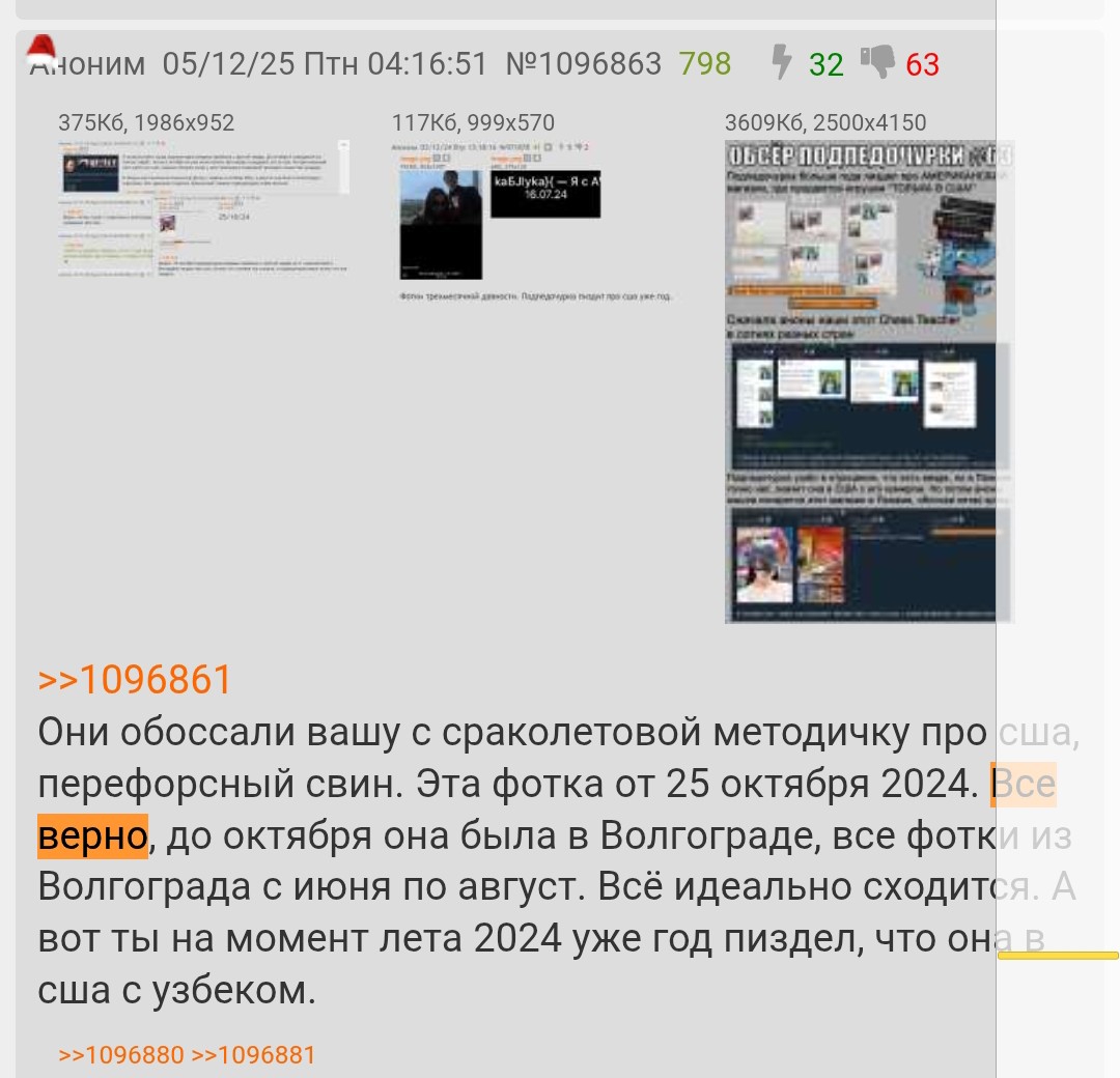 >>1099042 Свинья перефорсная, пытающаяся выставить зраду за перемоху. Аноны в первую очередь утверждали, что форс про США это срикерный пиздеж. И мы оказались полностью правы. Волгоград это просто первое наиболее вероятное местонахождение (последние запруфанные фотки от августа 2024 были именно из Волгограда), поэтому мы придерживались этой версии. То, что она сейчас в Панаме полностью опровергает твою газонюшную шизу. Ты неспроста так отчаянно форсил пиздеж про США, потому что это очень важная деталь в твоей методичке, т.к. в США очень сложно попасть, и если б она была в США, то это было бы косвенным пруфом, что она действительно жената на узбеке, потому что никак иначе туда такая тупая пизда попасть бы не смогла. Именно поэтому ты 3 года рвал жопу, отстаивая этот газонюшный форс. Теперь мы узнали, что она в Панаме, куда россияне легко прилетают без визы, что пиздец как обосрало твои трехлетние старания с перемогой спизженными фотками американцев, которые мефедроновая постила в тг, пытаясь всех обмануть.