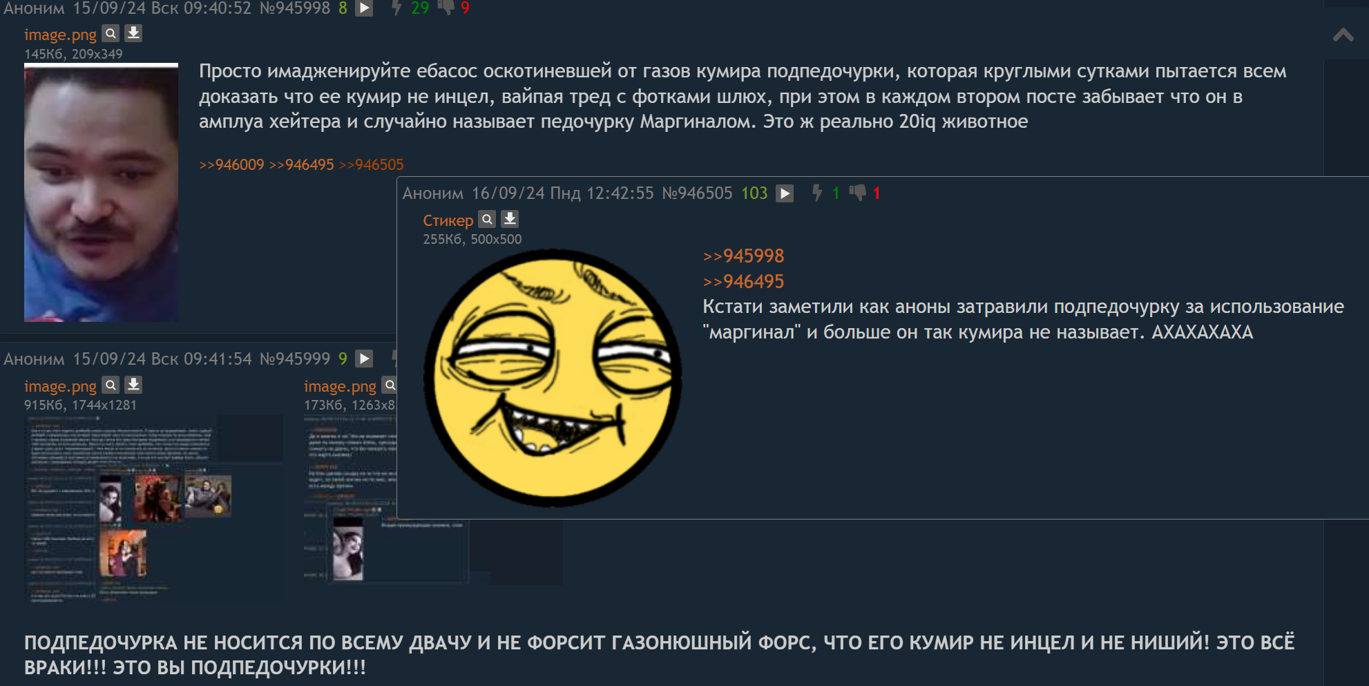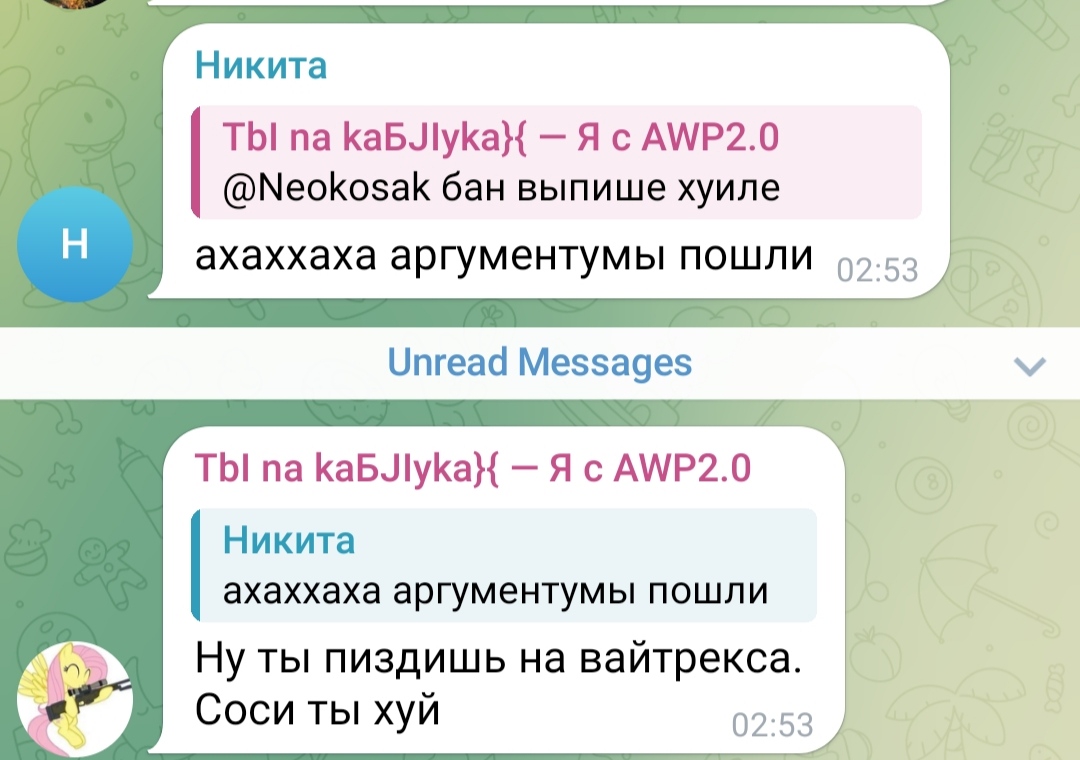 "Ну зачем вы кидаете пруфы, что я 2 года форсил пиздеж солевой блядины и всех её модераторов(((( Ведь теперь никто не поведется на мой перефорс с попыткой выдать хейтеров подпедочурками((("