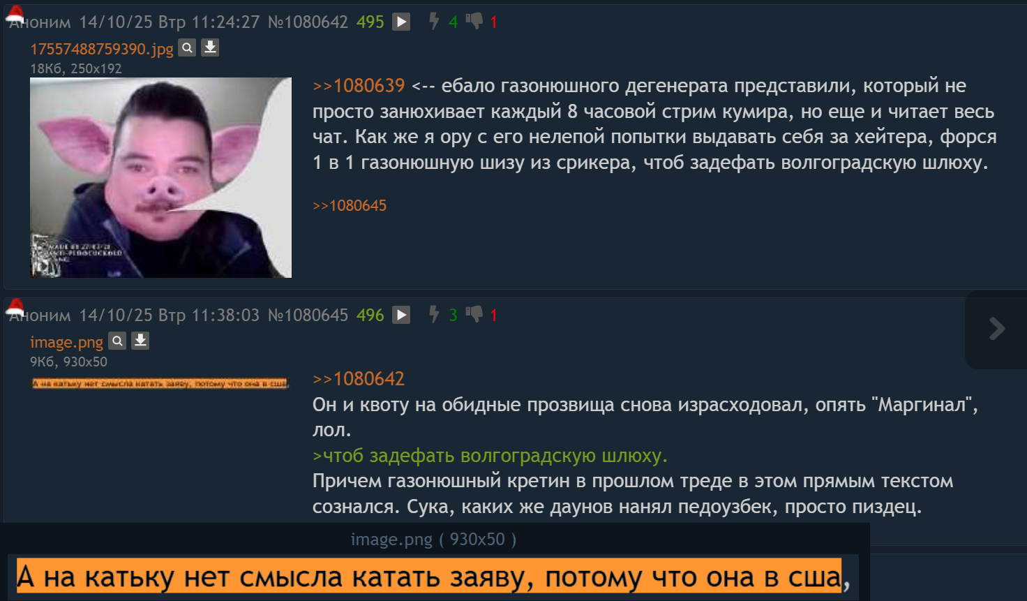 Олень сабж отправляет бабки солевой шмаре, которая 10 лет разводит таких скуфов инцелов как он. Сама она его куколдит с 2 метровым чедом. Аноны много лет с этого угарали, но год назад в тред пришло перефорсное животное подсос сабжа, который начал форсить шизу, что она на самом деле с ним, потому что у нее на стене разноцветная тряпка и у него на стене разноцветная тряпка, у них у обоих наушники air pods (неиронично вот такая тупость выдается за пруфы). Месяцы напролет он форсил, что она с сабжем в США, но недавно шмара спалилась, что сейчас чиллит в Панаме со своим чедом и в США она никогда не была, заруинив весь переможный форс.