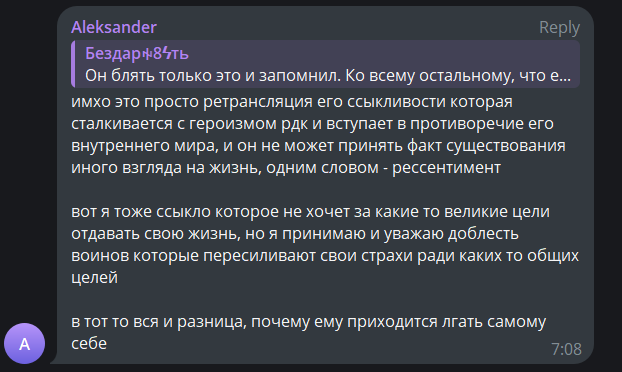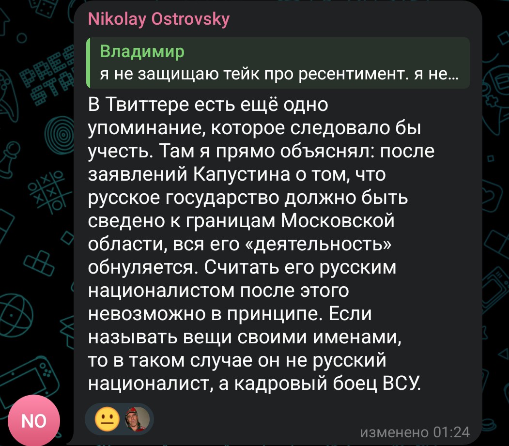 >>1105025 Типичный продукт "впитывания" политвзглядов через кумира, тусовочку и т. д. В целом, Островский и Сороколетова–одного поля ягоды (просто она совсем тупая). То есть они свои взгляды осмыслить не пытаются. Сказал Сармат/Артамонов/окружение, что вот это–хорошо, а то–плохо значит, так и есть. Получу лайков за свои посты