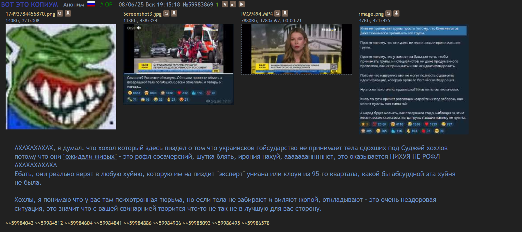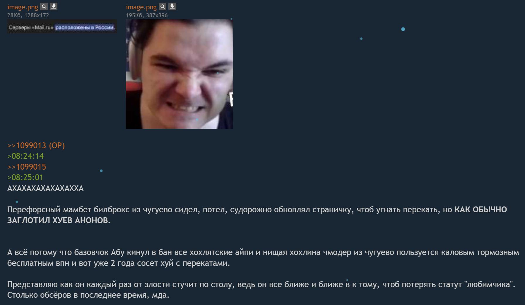 Перефорсный мамбет билброкс из чугуево сидел, потел, судорожно обновлял страничку, чтоб угнать перекать, но КАК ОБЫЧНО ЗАГЛОТИЛ ХУЕВ АНОНОВ.