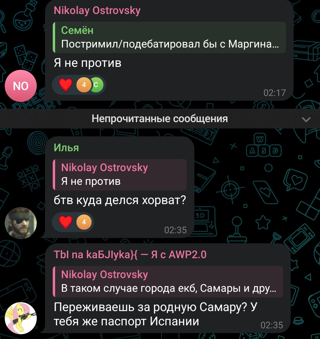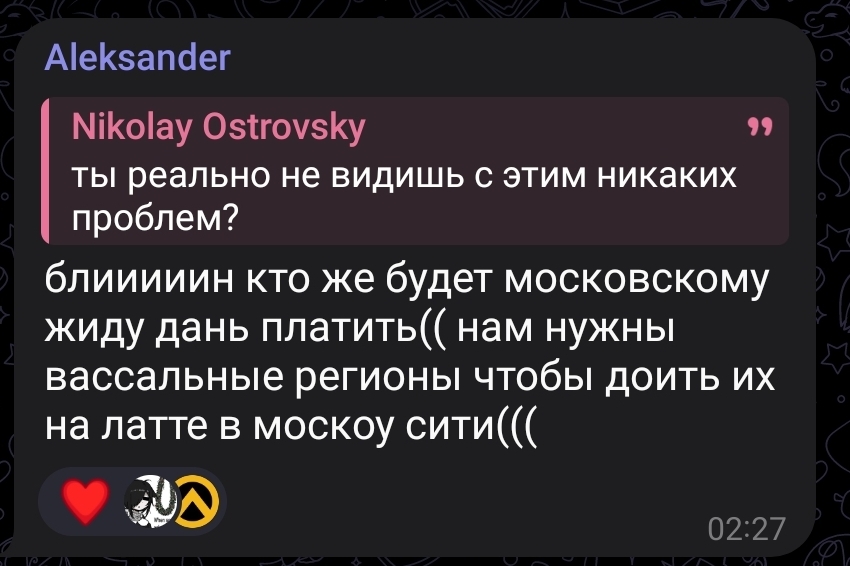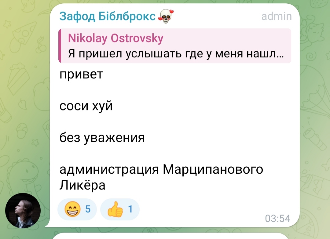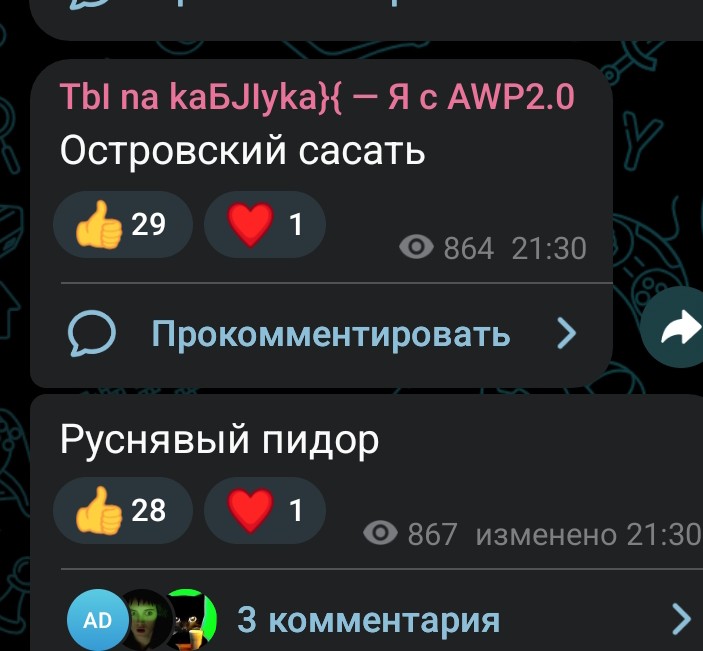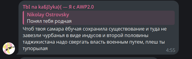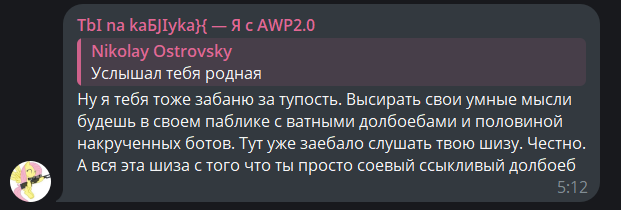 Пиздец, там в чате у Островского чел написал про "дочь фсб-шницы" и пост снесли. Ну хуй с ним, что мвд-шницы, однако терпение железное.. Как же он терпит, воооооу... Воооооу. Кремень.