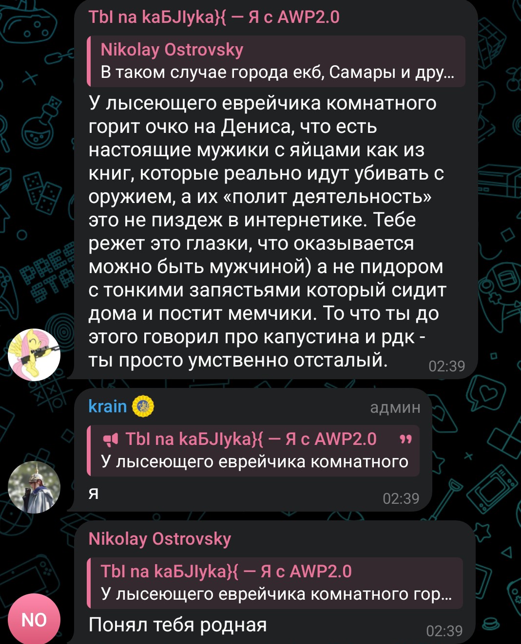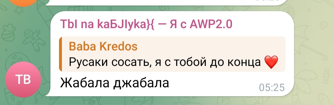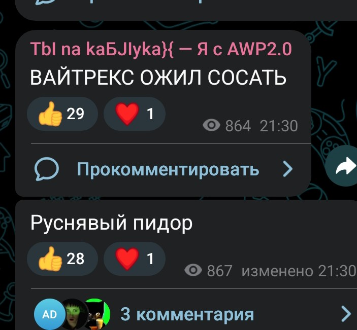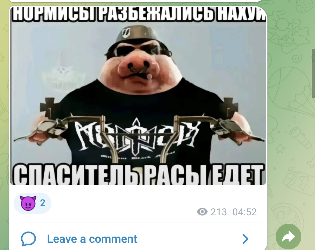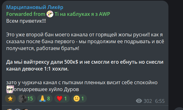 >>1105001 >>1105008 Короче, надо просто репортить каждый мало-мальски провокативный срикёрный пост, каждого газонюха в чате, каждый день. Мочерация в телеге работает через очко, до мочи доходит кайнд оф 30% репортов, поэтому надо тупо бомбардировать пидорятню ковровыми жалобами. Как-то раз таким образом срикёрные газонюхи скоординированно снесли Кванче чат в КБ. Если мы сможем уебать срикёр, или хотя бы их чат, то у существования этого каловайпнутого копротредика появится смысл.