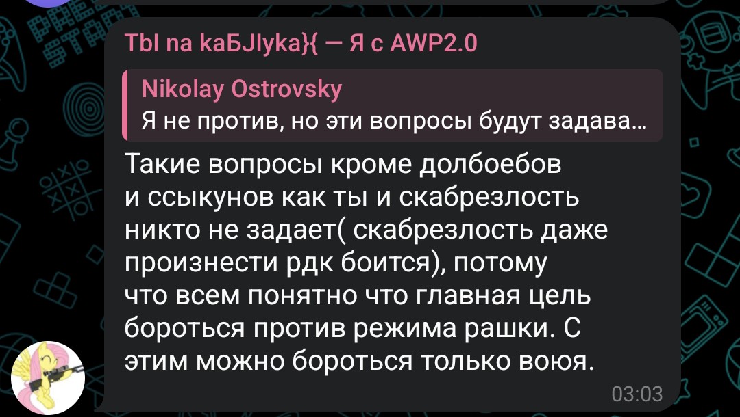 Да рофел больше в том, что Анатолий подобными заявлениями, пусть и мнимо, ставит себя в один ряд с крутыми парнями. Хотя в реале не факт, что раз на раз он не опиздюлится от Островского