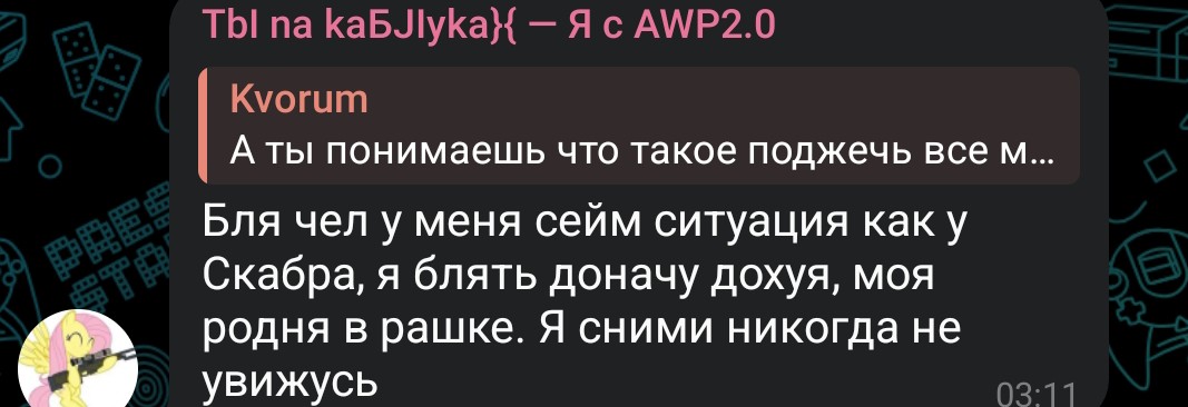 Екалдырина уже пишет, что марго не "настоящий мужик с яйцами, а только в интернете пиздеть горазд". Походу марго в точности копирует её позицию, когда говорит про ресентимент к накачанным амбалам c оружием. Она реально уже пилит ему мозги со словами типо "ты не настоящий мужик, вот на дениса посмотри, яйца как из книг, другое дело". Доводит, а потом Марго на стриме рассказывает, что рыдал как сука из за смерти вайта. Но когда он ожил пилить эта блядь будет только больше.