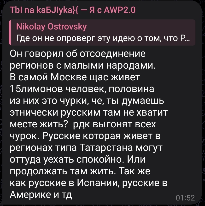 По сути, он прав. Учитывая, что Островский постоянно орëт буквально про необходимость национального государства (моноэтнического) на своих стримах, то каким образом он предлагает на территориях с разными этносами установить моноэтничность?