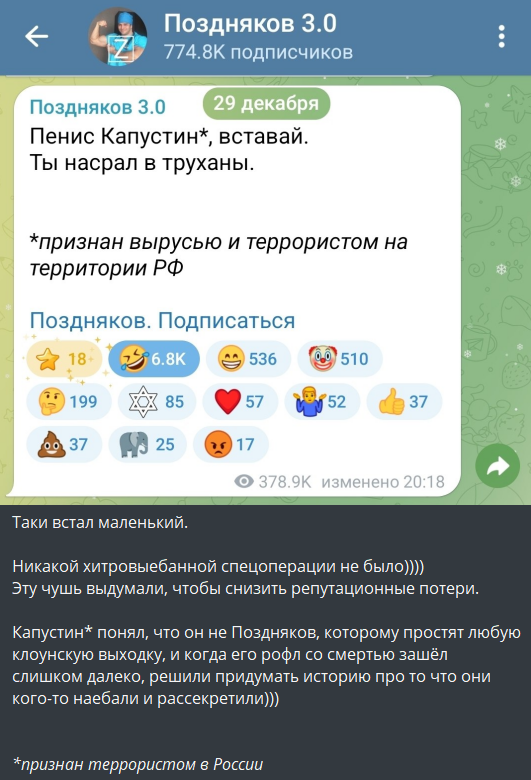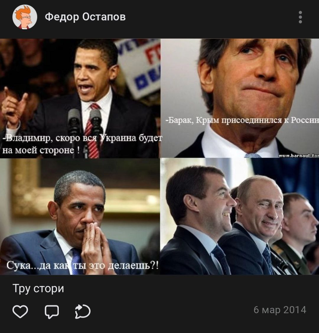 Катюш, это не родители скабра поддерживали аннексию Крыма. Это сам федор остапов был ватным скотом который постит такие мемчики на папиной странице в вк. Он был любителем навернуть егорки погрома и ватоадмина. Прям как твой муж.