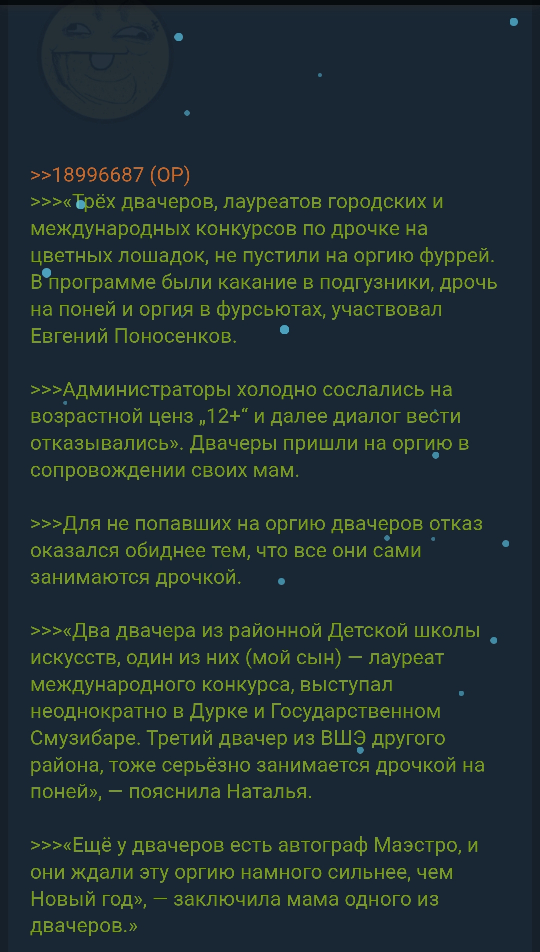 >>1100587 Один наш общий знакомый всю жизнь варится в собственном соку, облизываемый своими хомячками-помощниками, которые убеждают его в гениальности и превосходстве над всем живым, в связи с чем он считает, что повторяя однотипные посты про древние бредни\ тупых пёзд, желающих его захомутать\ негров которые кого то там режут\ про то, как он прямо сейчас может всё разрулить\ про ии который поработит человечество\ суетные новостишки\ про "ночь с Понасенковым за 15М российских рублей (хотелось бы посмотреть на тех, кто воспользовался подобной услугой)\ и т.д. он всем открывает глаза, являясь уберменьшем, на котором до сих пор держатся остатки цивилизации. По факту, просто попытка откусить кусок пирога от былой славы в году двадцатом (чем взял изначально, повторением того пытается взять и сейчас) и желание убедить как можно больше миловидных 15-летних мальчиков в своём могуществе, возвышенности и благородном происхождении, ну и конечно же в ЕВГЕНИАЛЬНОСТИ (простое человеческое слово "гениальность" уже не канает). А очень жаль это наблюдать, мог бы остаться в истории как властитель дум российской интеллигенции 20х годов (и немного 10х) 21 века