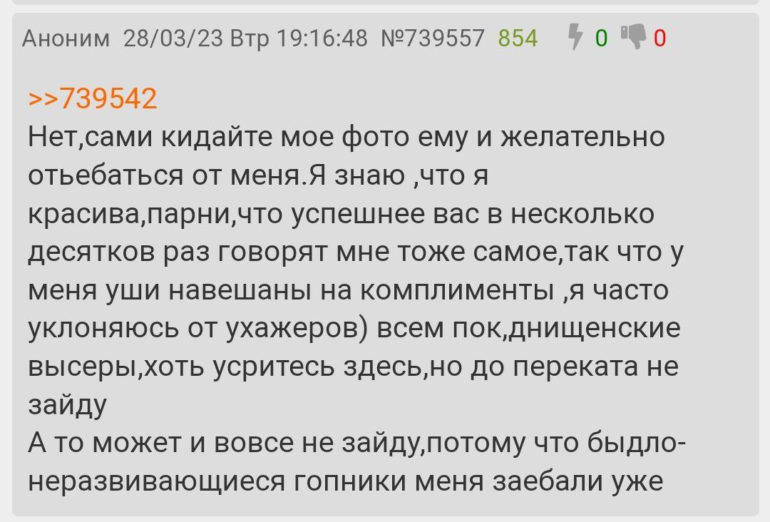 А вообще, тут ничего не сказать, кроме: "Господи, спаси и сохрани молодёжь от обнаглевшей плесени". Вообще, за всё время не было обнаружено ни одного поклонника такого уровня наружности, даже за килоМэтр никто не стоял, про таланты вообще молчим, на первом фото треда показан самый яркий талант.