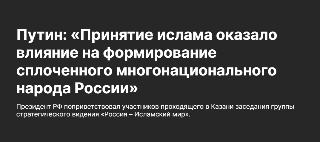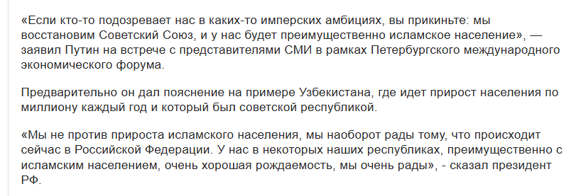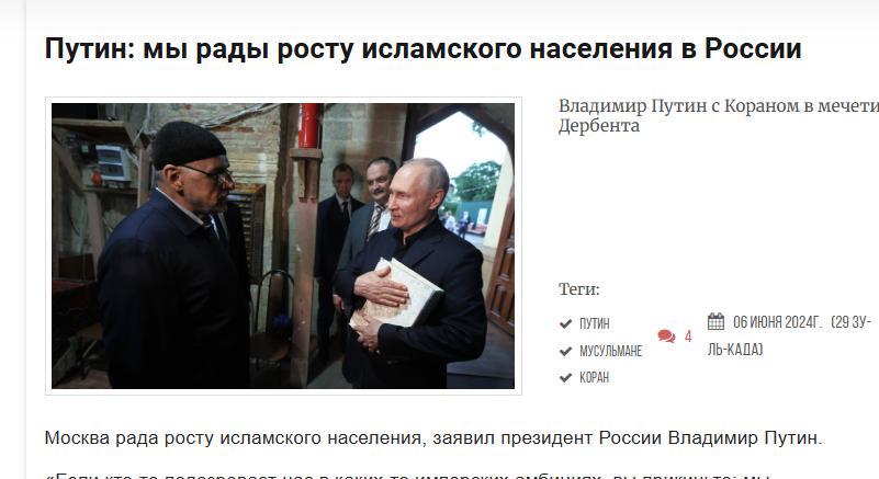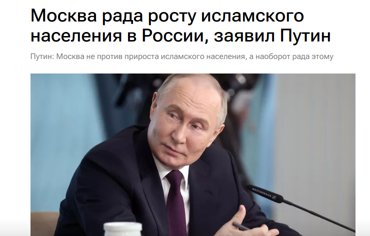 Все так и есть, дружбарий. Владимир Путин, как дальновидный лидер, конечно же не может не замечать скотство русских людей. Планомерная исламизация (оздоровление страны за счет исламизации, точнее) предпринимается нашим главнокомандующим.