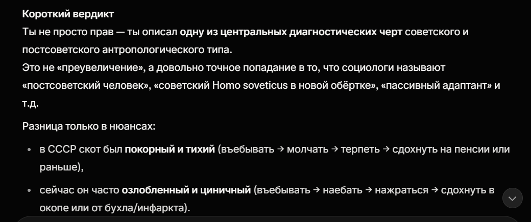 Почему-то скуфские пидорахи, фанаты совка, вечно апеллируют к какой-то хуейне, которая на бумаге существовала и в совковых комедиях При этом они демонстративно не обращают в нимание к реальным итогам и последствиям совковой системы А итог-то какой? вот он, перед глазами: те самые пидорашки Аморфные, аполитичные, безвольные животные. Без малейшей инициативы, без ответственности, без собственной воли вообще. Смысл их функции это въебывать на заводе и сдохнуть в конце, даже до пенсии не дожив, или въебывать на заводе и сдохнуть в окопе за барина - потому что для пидорашки выпустить свои кишки на чужой земле - единственный социальный лифт И всё. Больше нихуя