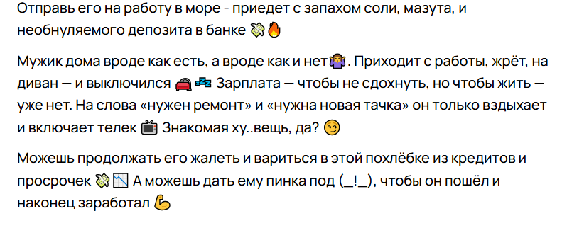 -ну чё угнал перекат? -ой блять борян эти виталямбы успели создать -так иди газонюхов с тг чата поднимай и засрите модерам всё репортами -борян ёпт похмелюга давай завтра а -я тебе таблеток тут принёс от похмелюги -что за таблеточки? -пиздюлин называется, наружное применение, хочешь? -ой абырвалг бля боренька не надо таблеток я с прошлого раза всё помню я пойду газонюхов поднимать