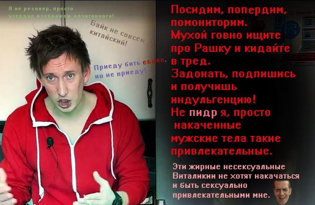 Все видят, но никто не говорит публично теперь он кроме мотошиза еще и гомик в общественном понимании этот стрим был пару дней назад - еще не расцвели плоды социальной инжинерии Но подмечено верно - пересвет на ебале (потому что на дваче его старым скуфом называют) - тейк про живет с мамой - тейк про гейство - тейк про мото-пиздабольство - тейк про нищиту - тейк про ведущего селюк тв - тейк про оправдания перед "кем-то" За два часа выжимка тредов знатная получилась, рофляно