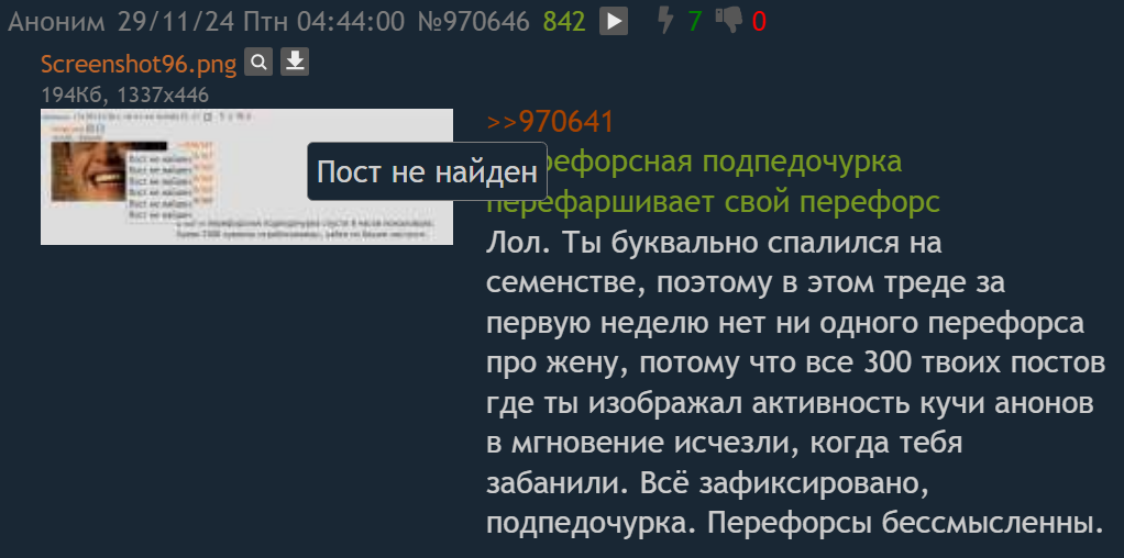 >>1115577 Напоминаю, что подпедочурке однажды удалось влезть своим свиным рылом в мочераторы и он начал удалять все посты про жену, но свинью глубокого залегания быстро сдетектили и прогнали ссанной тряпкой, поэтому он с порванной дупой постит скрин со своей перемогой из одного треда 2024 года.
