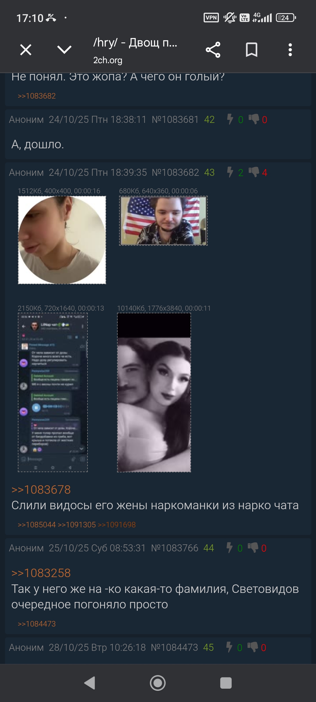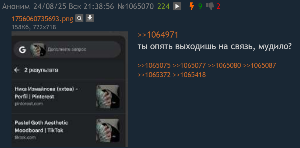 >>1121396 >Звуковые пуки Ну это совсем несерьезно. Случайные регулярные звуковые пуки явно в соседней комнате он надо полагать по радиосигналу вызывал? Голосовуха вообще имеет голос катьки и запись слишком чистая особенно в плане интонаций, на 11лабсов уже не спишешь и это уже никак не перекрыть. >Буквально здесь Так зачем катьку то блять учитывая весь ее бэкграунд и то что у нее есть/будет парень который обоссыт всю теорию? Ты совсем ебанько? Это же никак не бьется даже если пытаться смотреть с твоей позиции. >>1121401 >4мертные шахматы Скорее с твоей позиции, ибо маняврирований нужно допустить кратно больше начиная с банальной изначальной причины. >Этот пост Этот пост настолько очевидный шизовый наброс что даже не заслуживает букв если ты до сих пор не понял почему-то до сих пор. Пиздец что должно быть в голове конечно чтобы не понять.