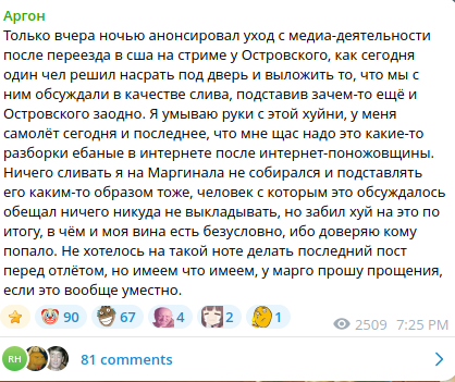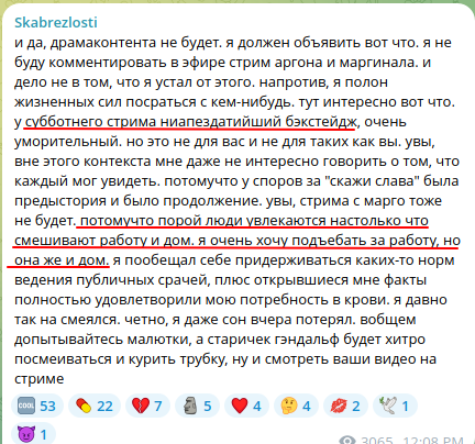 Посмотрим сегодня, как Скабрезлость прокомментирует ситуацию на стриме. До слива он намекал, что Срака называла его жирным, ватным и конторским. После слива он только написал вчера "Аргон, конечно, поражает. Трикстер, сын тзинча". Как уважающий себя гей Федя вроде бы крайне не любит, когда на него залупаются всякие прошмандовки. Интересно, воспользуется ли он возможностью пнуть хромую свинью и похайпить или затерпит, сглотнет и будет "не лезть в личную жизнь" бывшего педокумира.