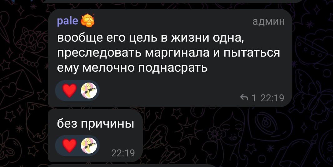 >скрыто форсила >скрыто форсить Ходить на стримы росова с овер 1к онлайном и визжать "ЙА ДЕВУШКА МАРГИНАЛА" это не скрытно, форситься в тг и дискорде с одобрением админов это не скрытно, выкладывать протухшие фотки с узбеком из 2022 во всеобщее обозрение это не cкрытно, заставлять подсосов клепать хайлайты про ДЕВУШКУ МАРГИНАЛА на овер 50к просмотров это не скрытнo, отправлять воздушные поцелуи "жене" прям на стриме это не скрытно, включать видос сакрамара, смотреть его от начала до конца с шизой про жену, это не скрытно, перефорсная подпедочурка.