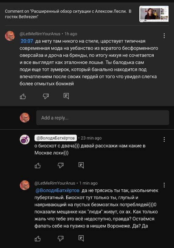 >3) Почему он не закроет канал если ему в комментах на ютубе пишут что он шизоид и долбаеб, а той же телеге (где якобы все озадачены поиском кнопки расширеного) ему это дублируют. Что-то я не замечал, чтоб его особо сильно хуесосили. Даже в этом треде нашлась парочка умственно отсталых подсосов.