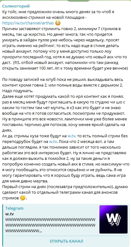 Тарелка юная, тупая и временная, она немного повлияла на переезд 100%, но основная причина это конечно могилизация, видимо сбу стало вымогать у Папича слишком много денег. Плюс ныне поражение Украины неотвратимо, какой ужас будет творится в этой предсмертной агонии одним богам известно. Папич был всегда антиукраинских взглядов и даже после начала войны ему удавалось отмалчиваться, но теперь опасно. Может быть из него могли сделать козла отпущения и принести в жертву укр. общественности, он в этом плане хороший кандидат для зели и ко. Короче валить надо точно и зная Папича ещё с топиков первой доты на продоте, могу сделать вывод, что свалил он надолго, если не навсегда. Но плохо другое. Он теперь раб казиномафии, пусть и в золотой клетке, но раб. Настоящий раб, в прямом смысле этого слова, отныне он вещь, а не человек. Папаня многое пережил: и ненависть масс и обвинения в педофилии и расизм и баны и всю другую хрень. Чего только не было за эти 11 лет его стримерской деятельности. Но видимо таки настал конец. Он больше не будет прежним Артасом, лучшим в мире за работой, теперь вынужден плясать под чужую дудку, занимаюсь противными своей природе вещами. Величайшего купили за жалкие бумажки.